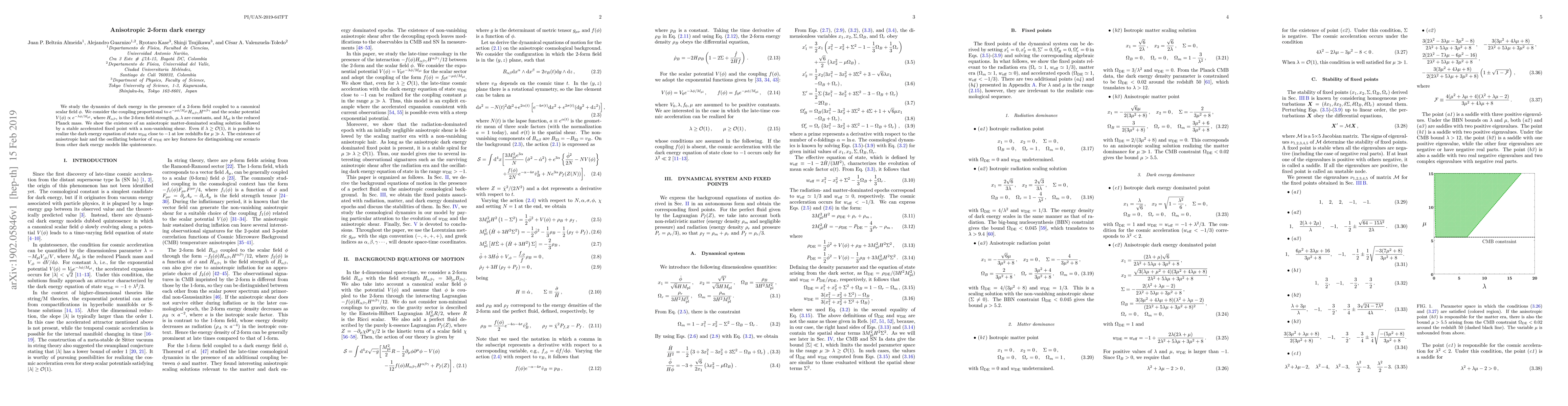 We study the dynamics of dark energy in the presence of a 2-form field coupled to a canonical scalar field $\phi$. We consider the coupling proportional to $e^{-\mu \phi/M_{\rm pl}} H_{\alpha \beta \gamma}H^{\alpha \beta \gamma}$ and the scalar potential $V(\phi) \propto e^{-\lambda \phi/M_{\rm pl}}$, where $H_{\alpha \beta \gamma}$ is the 2-form field strength, $\mu, \lambda$ are constants, and $M_{\rm pl}$ is the reduced Planck mass. We show the existence of an anisotropic matter-dominated scaling solution followed by a stable accelerated fixed point with a non-vanishing shear. Even if $\lambda \geq {\cal O}(1)$, it is possible to realize the dark energy equation of state $w_{\rm DE}$ close to $-1$ at low redshifts for $\mu \gg \lambda$. The existence of anisotropic hair and the oscillating behavior of $w_{\rm DE}$ are key features for distinguishing our scenario from other dark energy models like quintessence.