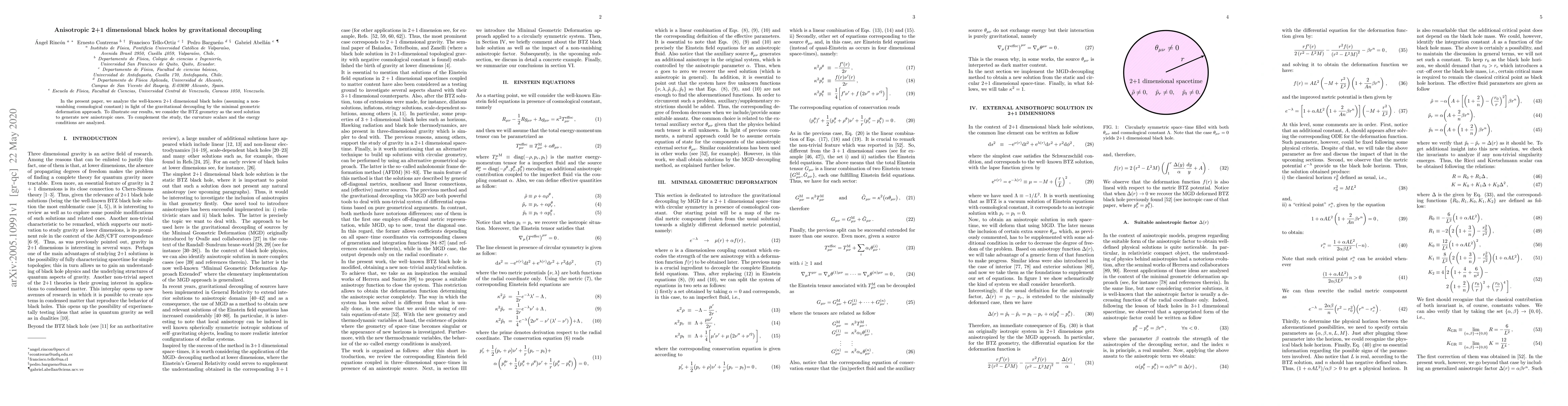 The paper extends the MGD formalism to 2+1 dimensions, introducing a new parametrization for the anisotropic tensor and generating analytic black hole solutions with anisotropic pressures.