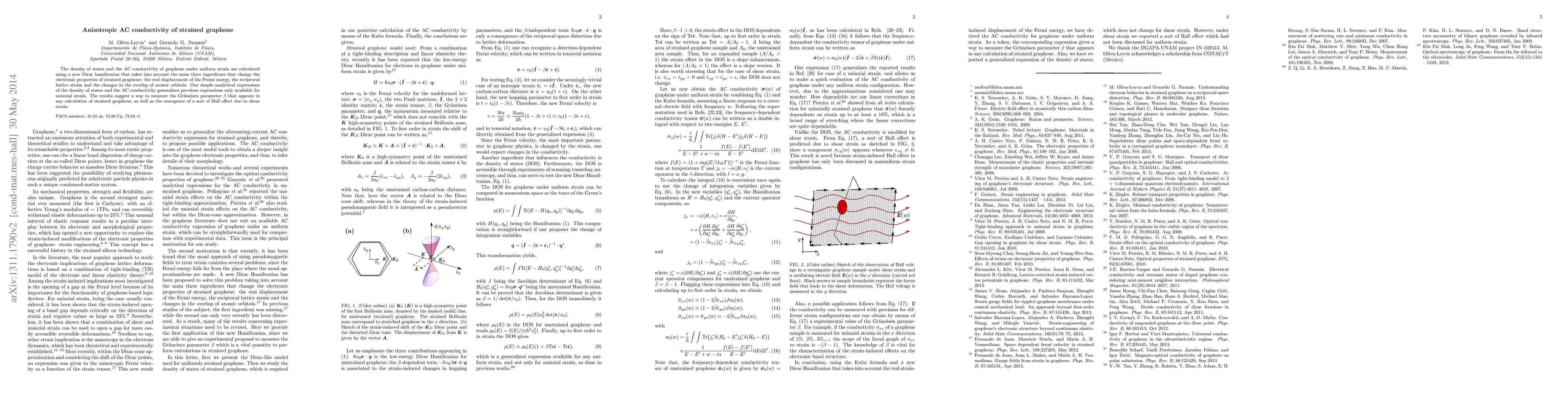 The density of states and the AC conductivity of graphene under uniform strain are calculated using a new Dirac Hamiltonian that takes into account the main three ingredients that change the electronic properties of strained graphene: the real displacement of the Fermi energy, the reciprocal lattice strain and the changes in the overlap of atomic orbitals. Our simple analytical expressions of the density of states and the AC conductivity generalizes previous expressions only available for uniaxial strain. The results suggest a way to measure the Gruneisen parameter that appears in any calculation of strained graphene, as well as the emergence of a sort of Hall effect due to shear strain.