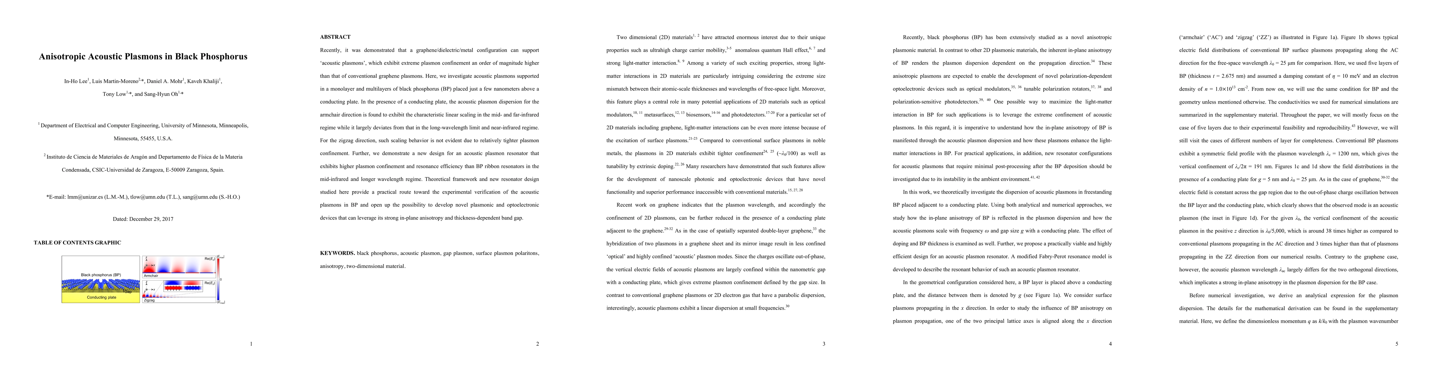 This paper investigates acoustic plasmons in black phosphorus, showing anisotropic behavior in different directions and proposing a new resonator design for enhanced confinement and efficiency in the mid-infrared regime. The study highlights the potential for developing novel plasmonic and optoelectronic devices leveraging black phosphorus's unique properties.