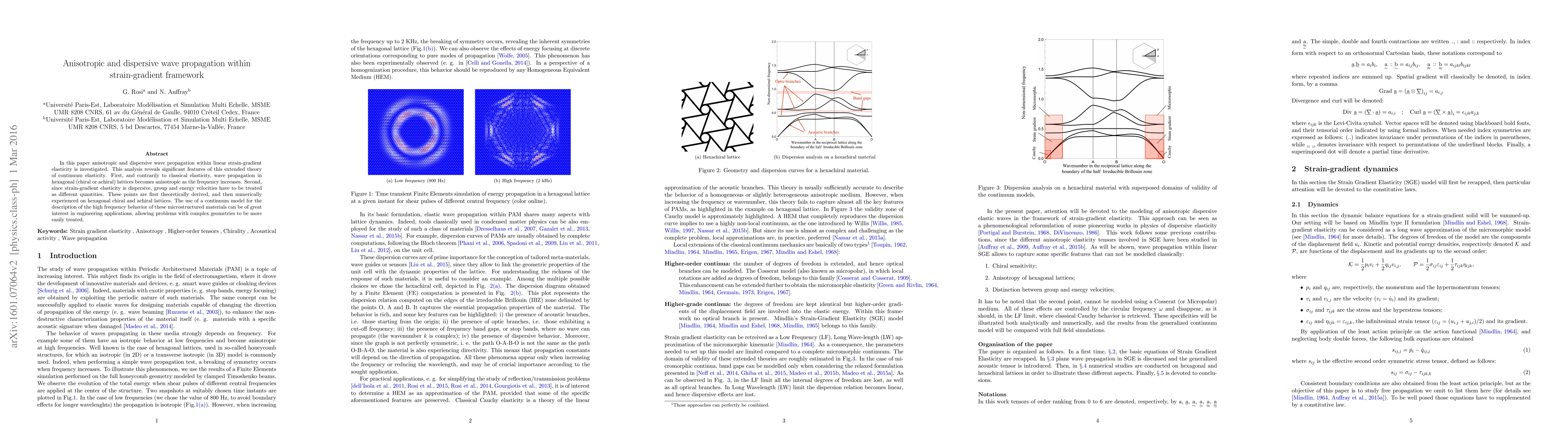 This paper investigates anisotropic and dispersive wave propagation in strain-gradient elasticity theory, revealing that frequency increases lead to anisotropy in hexagonal lattices and requiring separate treatment of group and energy velocities.