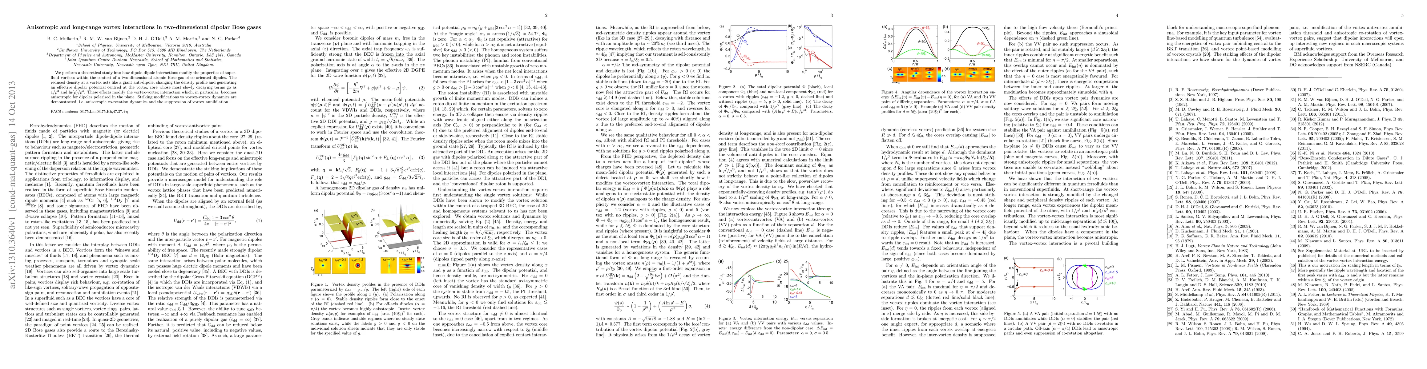 We perform a theoretical study into how dipole-dipole interactions modify the properties of superfluid vortices within the context of a two-dimensional atomic Bose gas of co-oriented dipoles. The reduced density at a vortex acts like a giant anti-dipole, changing the density profile and generating an effective dipolar potential centred at the vortex core whose most slowly decaying terms go as $1/\rho^2$ and $\ln(\rho)/\rho^3$. These effects modify the vortex-vortex interaction which, in particular, becomes anisotropic for dipoles polarized in the plane. Striking modifications to vortex-vortex dynamics are demonstrated, i.e. anisotropic co-rotation dynamics and the suppression of vortex annihilation.