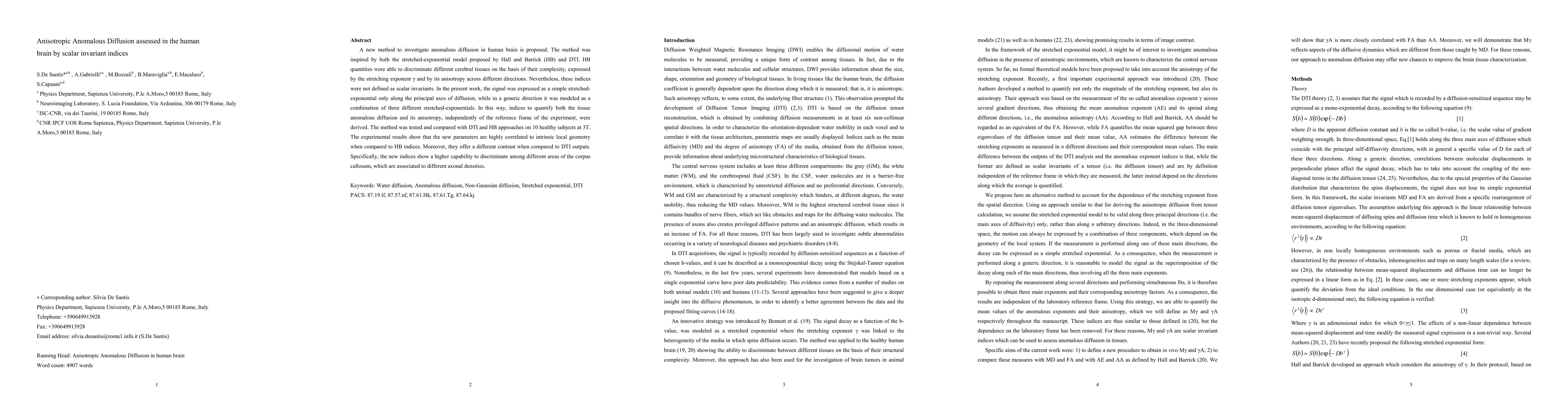 A new method to investigate anomalous diffusion in human brain is proposed. The method has been inspired by both the stretched-exponential model proposed by Hall and Barrick (HB) and DTI. Quantities extracted using HB method were able to discriminate different cerebral tissues on the basis of their complexity, expressed by the stretching exponent gamma and of the anisotropy of gamma across different directions. Nevertheless, these quantities were not defined as scalar invariants like mean diffusivity and fractional anisotropy, which are eigenvalues of the diffusion tensor. We hypotesize instead that the signal may be espressed as a simple stretched-exponential only along the principal axes of diffusion, while in a generic direction the signal is modeled as a combination of three different stretched-exponentials. In this way, we derived indices to quantify both the tissue anomalous diffusion and its anisotropy, independently of the reference frame of the experiment. We tested and compare our new method with DTI and HB approaches applying them to 10 healty subjects brain at 3T. Our experimental results show that our parameters are highly correlated to intrinsic local geometry when compared to HB indices. Moreover, they offer a different kind of contrast when compared to DTI outputs. Specifically, our indices show a higher capability to discriminate among different areas of the corpus callosum, which are known to be associated to different axonal densities.
