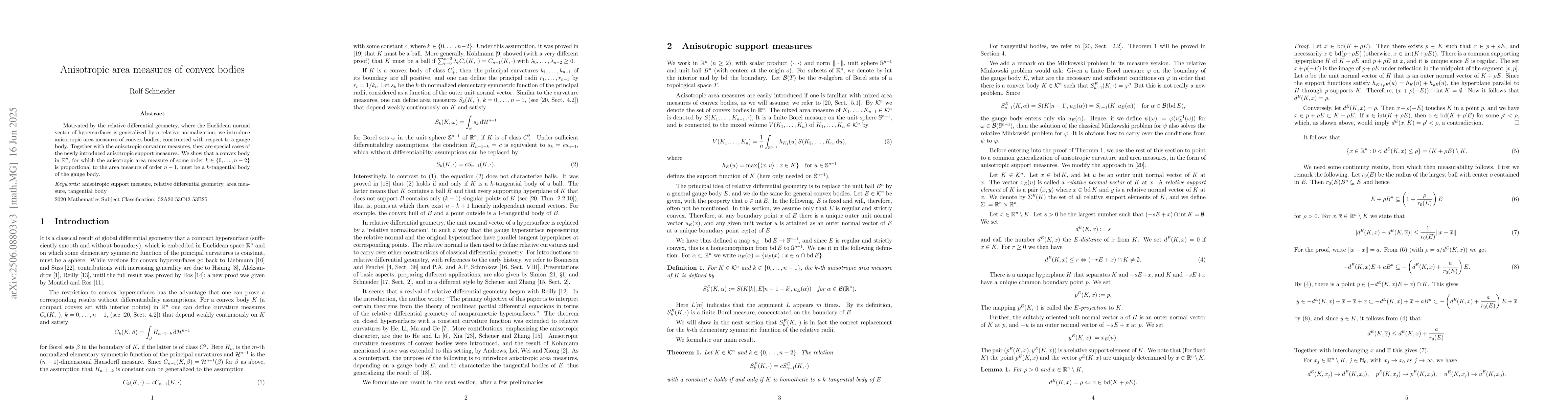 Motivated by the relative differential geometry, where the Euclidean normal vector of hypersurfaces is generalized by a relative normalization, we introduce anisotropic area measures of convex bodies, constructed with respect to a gauge body. Together with the anisotropic curvature measures, they are special cases of the newly introduced anisotropic support measures. We show that a convex body in ${\mathbb R}^n$, for which the anisotropic area measure of some order $k\in\{0,\dots,n-2\}$ is proportional to the area measure of order $n-1$, must be a $k$-tangential body of the gauge body.