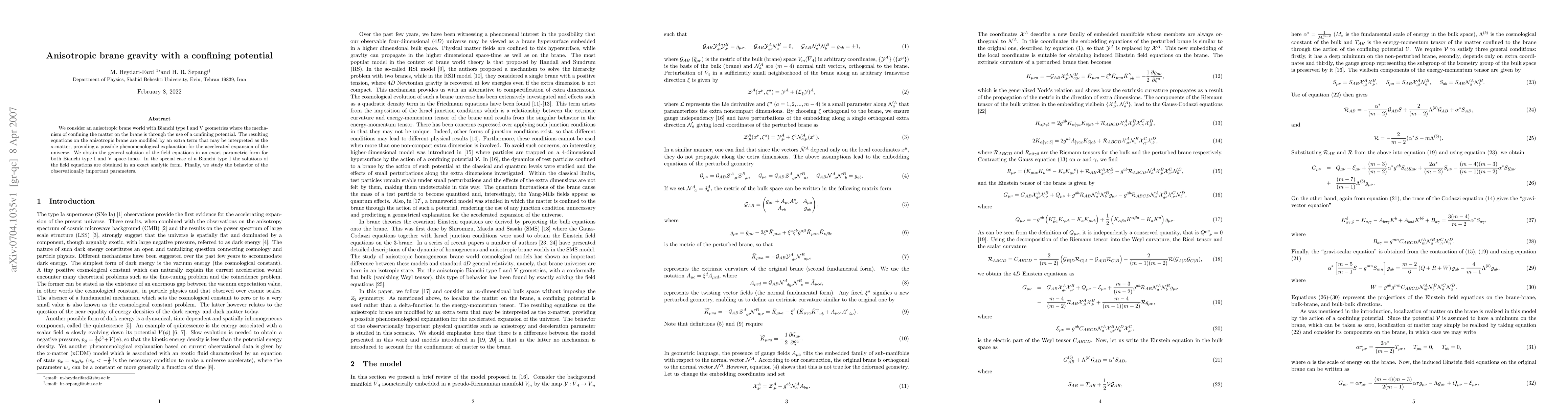 This paper explores anisotropic brane gravity with a confining potential, providing exact solutions for Bianchi type I and V space-times that may explain the universe's accelerated expansion.