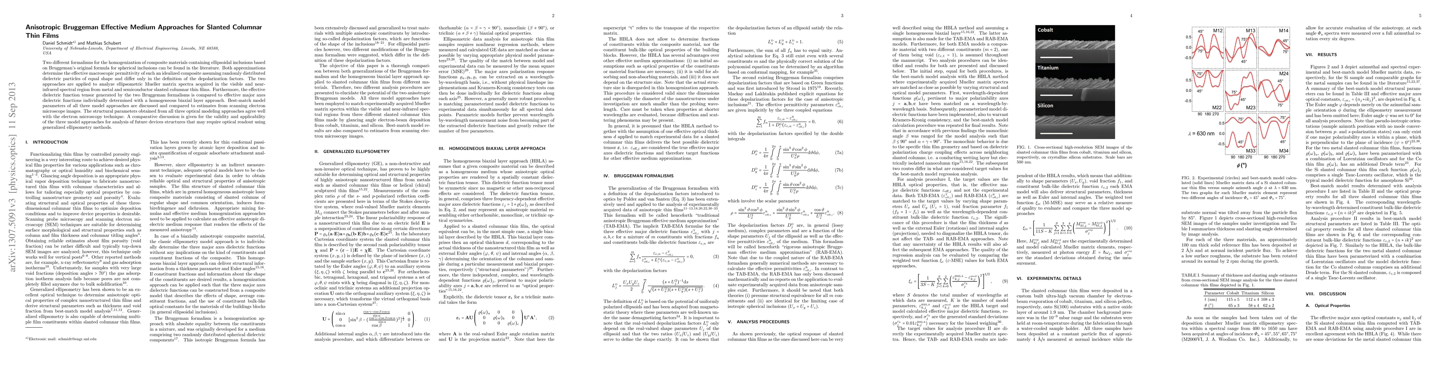 Two different formalisms for the homogenization of composite materials containing ellipsoidal inclusions based on Bruggeman's original formula for spherical inclusions can be found in the literature. Both approximations determine the effective macroscopic permittivity of such an idealized composite assuming randomly distributed dielectric particles of equal shape and differ only in the definition of the depolarization factors. The two approaches are applied to analyze ellipsometric Mueller matrix spectra acquired in the visible and near-infrared spectral region from metal and semiconductor slanted columnar thin films. Furthermore, the effective dielectric function tensor generated by the two Bruggeman formalisms is compared to effective major axes dielectric functions individually determined with a homogeneous biaxial layer approach. Best-match model parameters of all three model approaches are discussed and compared to estimates from scanning electron microscope images. The structural parameters obtained from all three optical modeling approaches agree well with the electron microscopy technique. A comparative discussion is given for the validity and applicability of the three model approaches for analysis of future devices structures that may require optical readout using generalized ellipsometry methods.