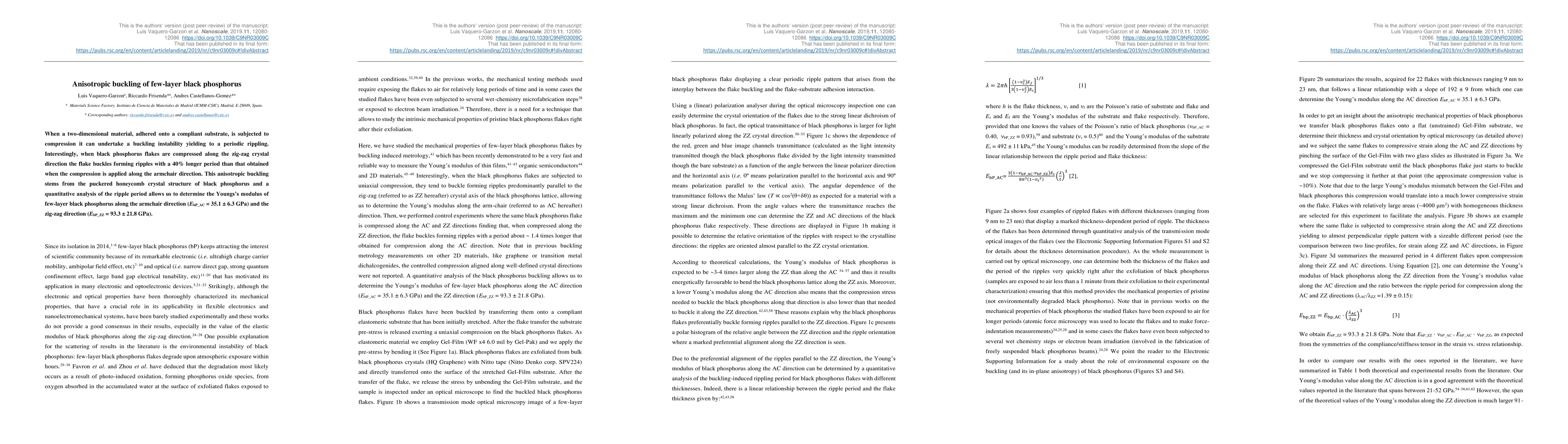 When a two-dimensional material, adhered onto a compliant substrate, is subjected to compression it can undertake a buckling instability yielding to a periodic rippling. Interestingly, when black phosphorus flakes are compressed along the zig-zag crystal direction the flake buckles forming ripples with a 40% longer period than that obtained when the compression is applied along the armchair direction. This anisotropic buckling stems from the puckered honeycomb crystal structure of black phosphorus and a quantitative analysis of the ripple period allows us to determine the Youngs's modulus of few-layer black phosphorus along the armchair direction (EbP_AC = 35.1 +- 6.3 GPa) and the zig-zag direction (EbP_ZZ = 93.3 +- 21.8 GPa).