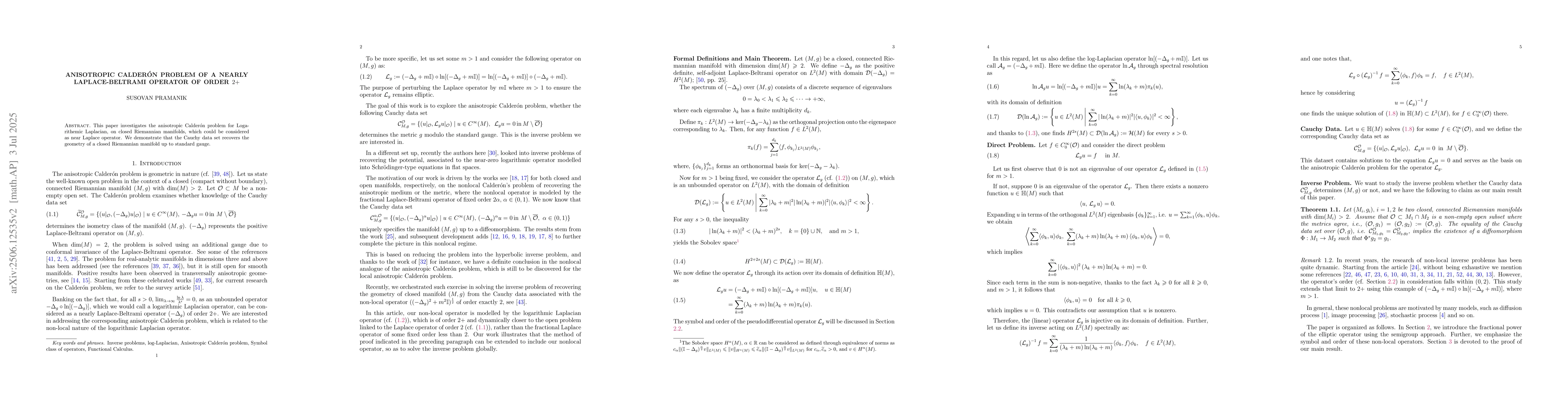 This paper investigates the anisotropic Calder\'{o}n problem for Logarithemic Laplacian, on closed Riemannian manifolds, which could be considered as near Laplace operator. We demonstrate that the Cauchy data set recovers the geometry of a closed Riemannian manifold up to standard gauge.
