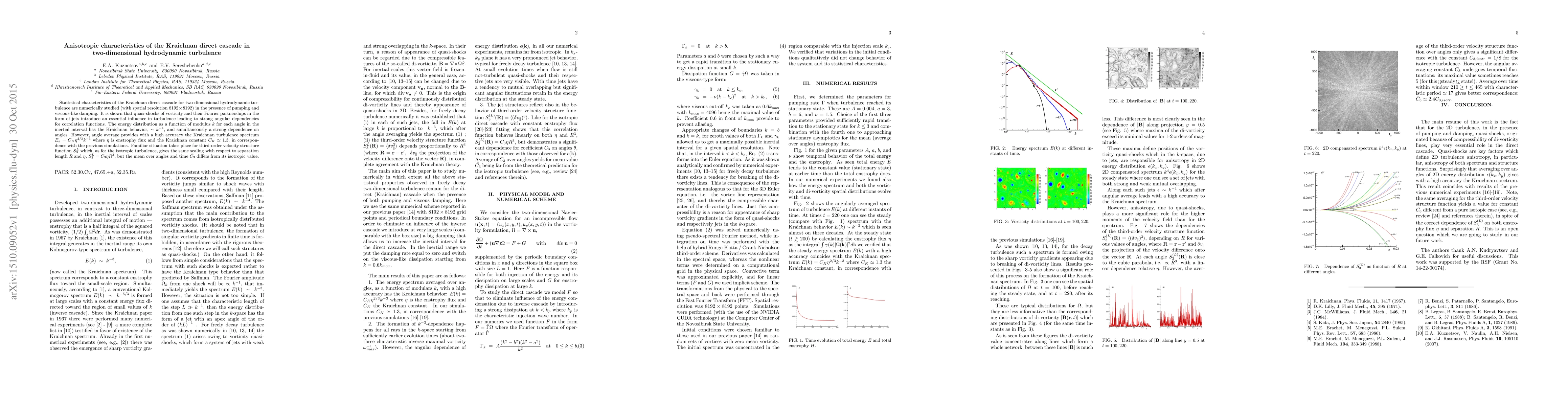 Statistical characteristics of the Kraichnan direct cascade for two-dimensional hydrodynamic turbulence are numerically studied (with spatial resolution $8192\times 8192$) in the presence of pumping and viscous-like damping. It is shown that quasi-shocks of vorticity and their Fourier partnerships in the form of jets introduce an essential influence in turbulence leading to strong angular dependencies for correlation functions. The energy distribution as a function of modulus $k$ for each angle in the inertial interval has the Kraichnan behavior, $\sim k^{-4}$, and simultaneously a strong dependence on angles. However, angle average provides with a high accuracy the Kraichnan turbulence spectrum $E_k=C_K\eta^{2/3} k^{-3}$ where $\eta$ is enstrophy flux and the Kraichnan constant $C_K\simeq 1.3$, in correspondence with the previous simulations. Familiar situation takes place for third-order velocity structure function $S_3^L$ which, as for the isotropic turbulence, gives the same scaling with respect to separation length $R$ and $\eta$, $S_3^L=C_3\eta R^3$, but the mean over angles and time $\bar {C_3}$ differs from its isotropic value.