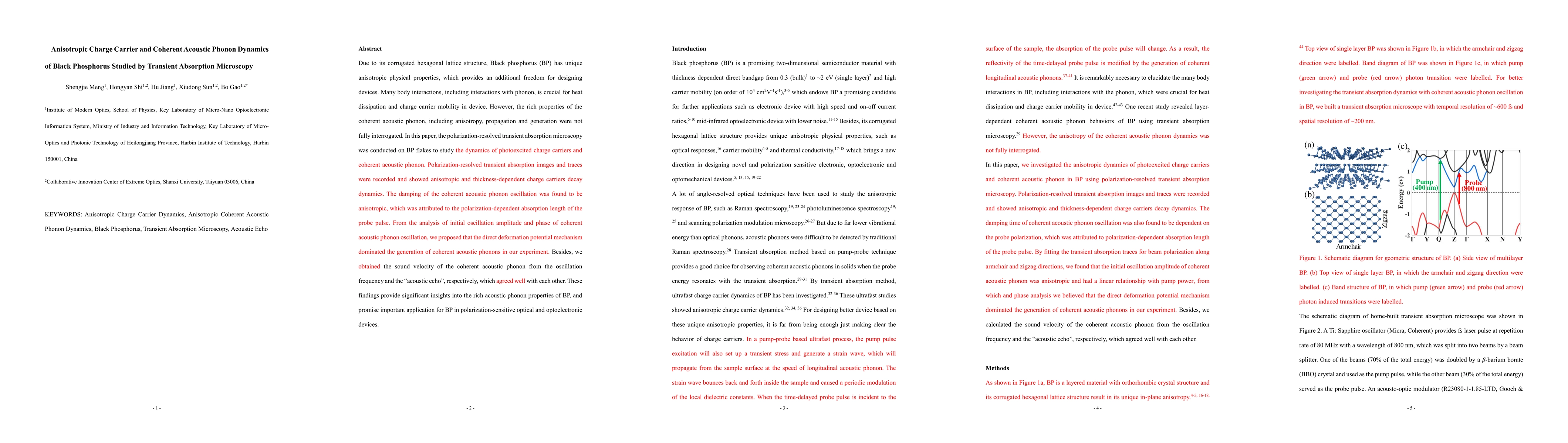 Due to its corrugated hexagonal lattice structure, Black phosphorus (BP) has unique anisotropic physical properties, which provides an additional freedom for designing devices. Many body interactions, including interactions with phonon, is crucial for heat dissipation and charge carrier mobility in device. However, the rich properties of the coherent acoustic phonon, including anisotropy, propagation and generation were not fully interrogated. In this paper, the polarization-resolved transient absorption microscopy was conducted on BP flakes to study the dynamics of photoexcited charge carriers and coherent acoustic phonon. Polarization-resolved transient absorption images and traces were recorded and showed anisotropic and thickness-dependent charge carriers decay dynamics. The damping of the coherent acoustic phonon oscillation was found to be anisotropic, which was attributed to the polarization-dependent absorption length of the probe pulse. From the analysis of initial oscillation amplitude and phase of coherent acoustic phonon oscillation, we proposed that the direct deformation potential mechanism dominated the generation of coherent acoustic phonons in our experiment. Besides, we obtained the sound velocity of the coherent acoustic phonon from the oscillation frequency and the acoustic echo, respectively, which agreed well with each other. These findings provide significant insights into the rich acoustic phonon properties of BP, and promise important application for BP in polarization-sensitive optical and optoelectronic devices.