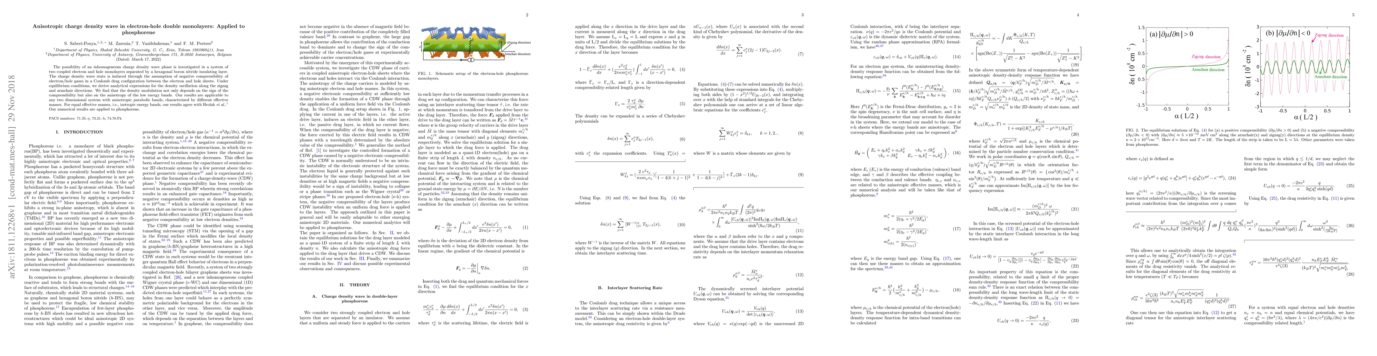 The possibility of an inhomogeneous charge density wave phase is investigated in a system of two coupled electron and hole monolayers separated by a hexagonal boron nitride insulating layer. The charge density wave state is induced through the assumption of negative compressibility of electron/hole gases in a Coulomb drag configuration between the electron and hole sheets. Under equilibrium conditions, we derive analytical expressions for the density oscillation along the zigzag and armchair directions. We find that the density modulation not only depends on the sign of the compressibility but also on the anisotropy of the low energy bands. Our results are applicable to any two dimensional system with anisotropic parabolic bands, characterized by different effective masses. For equal effective masses, i.e., isotropic energy bands, our results agree with Hrolak et al.[1]. Our numerical results are applied to phosphorene.