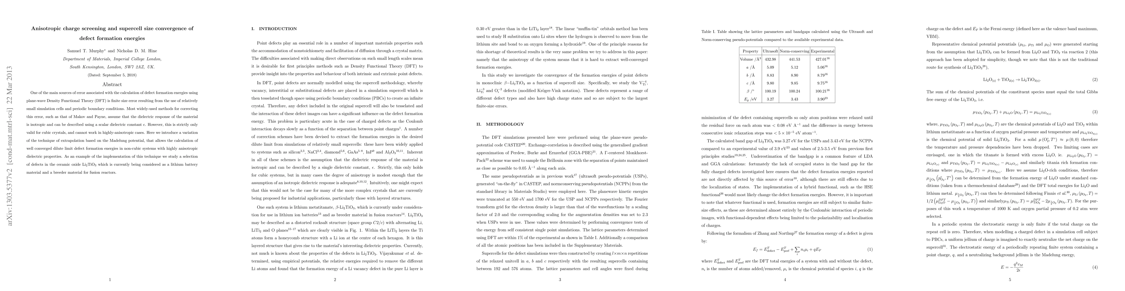 This paper proposes a method to correct finite size errors in defect formation energy calculations using plane-wave DFT, addressing the limitations of isotropic dielectric response assumptions. It demonstrates the technique's effectiveness in anisotropic materials like Li$_2$TiO$_3$, a candidate for lithium batteries and fusion reactors.