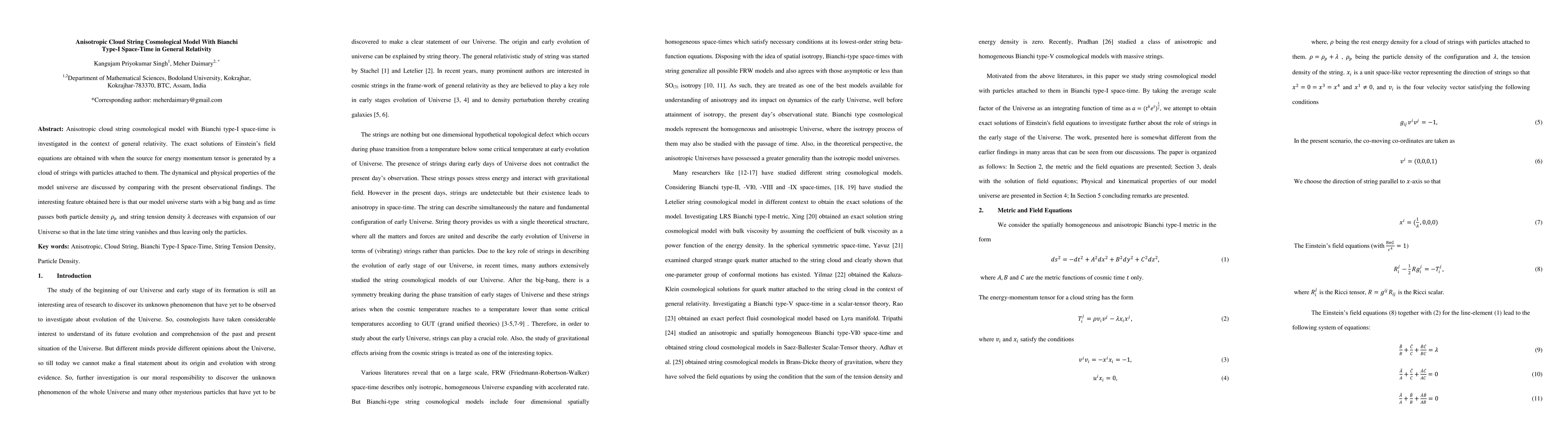 This paper investigates an anisotropic cloud string cosmological model within the framework of general relativity, deriving exact solutions for Einstein's field equations sourced by a cloud of strings. The model universe begins with a big bang, and over time, both particle density and string tension density decrease, eventually leaving only particles in the late-time universe.