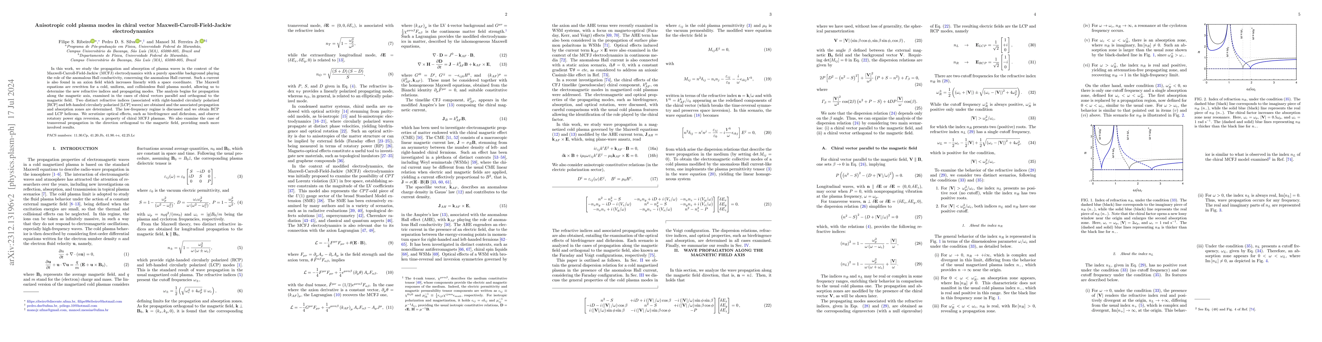 In this work, we study the propagation and absorption of plasma waves in the context of the Maxwell-Carroll-Field-Jackiw (MCFJ) electrodynamics, with a purely spacelike background playing the role of the anomalous Hall conductivity. The Maxwell equations are rewritten for a cold, uniform and collisionless fluid plasma model, allowing us to determine the new refractive indices and propagating modes. The analysis begins for the propagation along the magnetic axis, being examined the cases of chiral vector parallel and orthogonal to the magnetic field. Two distinct refractive indices (associated with RCP and LCP waves) are attained, with the associated propagation and absorption zones determines. The low frequency regime is discussed, with the attainment of RCP and LCP helicons. Optical effects, as birefringence and dichroism, are scrutinized, being observed rotatory power sign reversion, a property of chiral MCFJ plasmas. The case of transversal propagation to the direction orthogonal of the magnetic field is also examined, providing much more involved results.