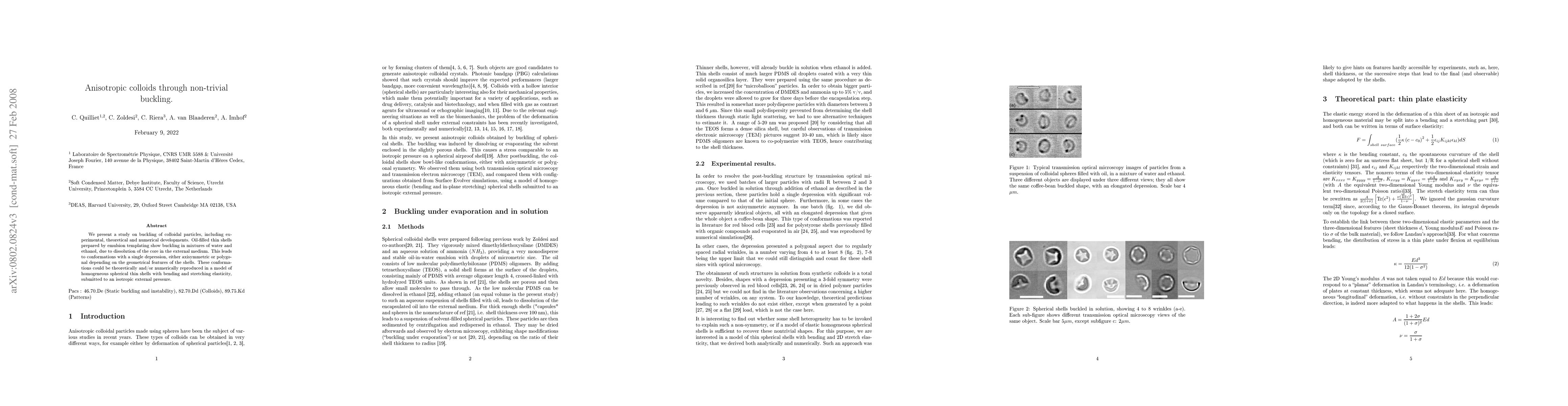 We present a study on buckling of colloidal particles, including experimental, theoretical and numerical developments. Oil-filled thin shells prepared by emulsion templating show buckling in mixtures of water and ethanol, due to dissolution of the core in the external medium. This leads to conformations with a single depression, either axisymmetric or polygonal depending on the geometrical features of the shells. These conformations could be theoretically and/or numerically reproduced in a model of homogeneous spherical thin shells with bending and stretching elasticity, submitted to an isotropic external pressure.