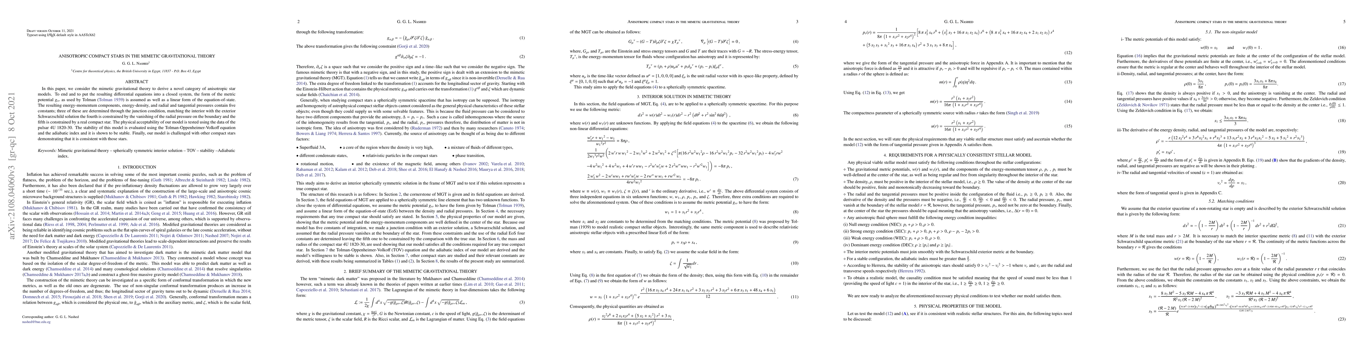 This paper develops anisotropic star models within the mimetic gravitational theory, deriving a closed system of differential equations with five constants. The model's stability and physical acceptability are tested against pulsar 4U 1820-30 data and confirmed to be consistent with other compact stars.