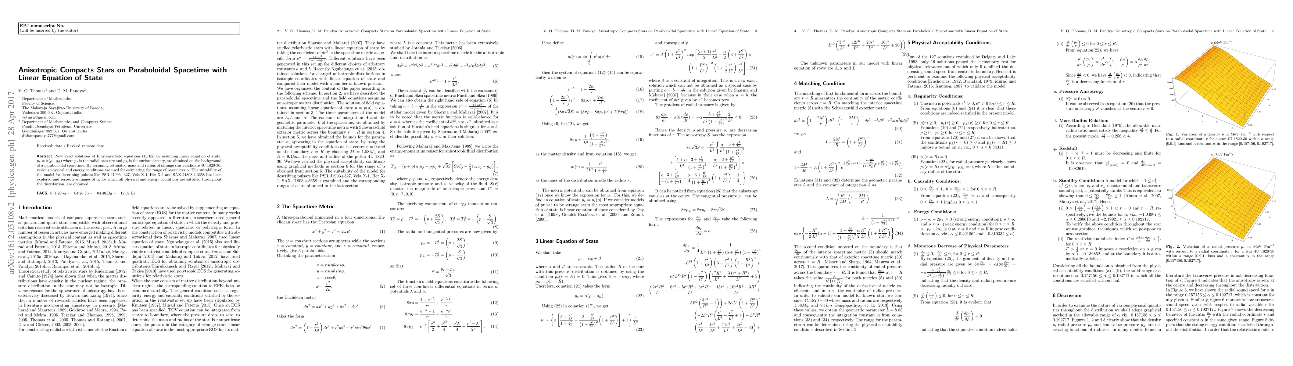 This paper presents new exact solutions to Einstein's field equations for anisotropic compact stars on a paraboloidal spacetime, using a linear equation of state. The study estimates parameter u03b1 for strange star candidate 4U 1820-30 and explores the model's suitability for pulsars like PSR J1903+327, Vela X-1, Her X-1, and SAX J1804.3658, determining respective u03b1 ranges satisfying all physical and energy conditions.