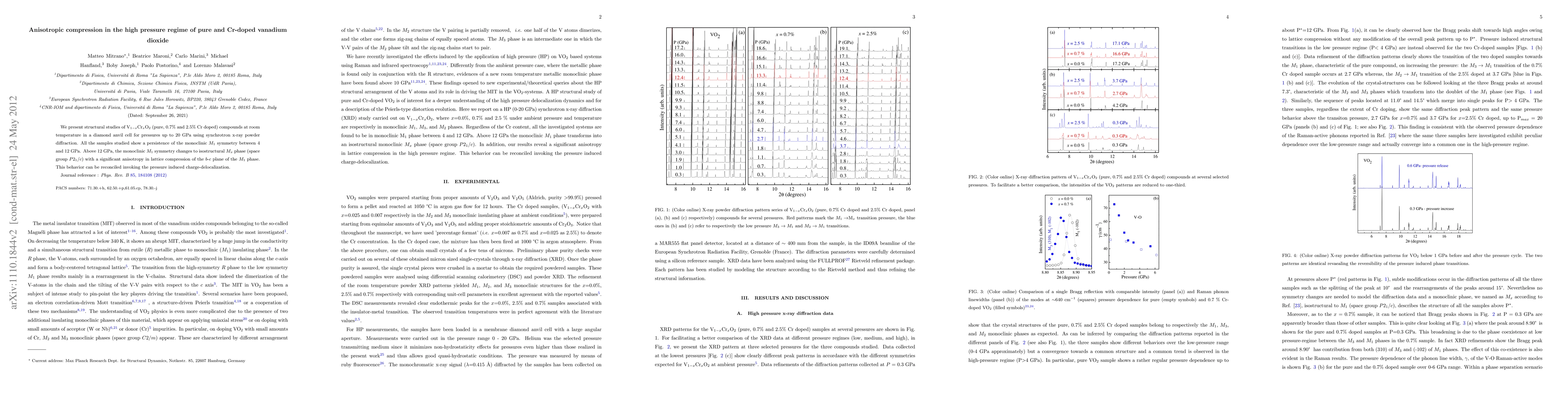 We present structural studies of V$_{1-x}$Cr$_x$O$_2$ (pure, 0.7% and 2.5% Cr doped) compounds at room temperature in a diamond anvil cell for pressures up to 20 GPa using synchrotron x-ray powder diffraction. All the samples studied show a persistence of the monoclinic $M_1$ symmetry between 4 and 12 GPa. Above 12 GPa, the monoclinic $M_1$ symmetry changes to isostructural $M_x$ phase (space group $P2_1/c$) with a significant anisotropy in lattice compression of the $b$-$c$ plane of the $M_{1}$ phase. This behavior can be reconciled invoking the pressure induced charge-delocalization.