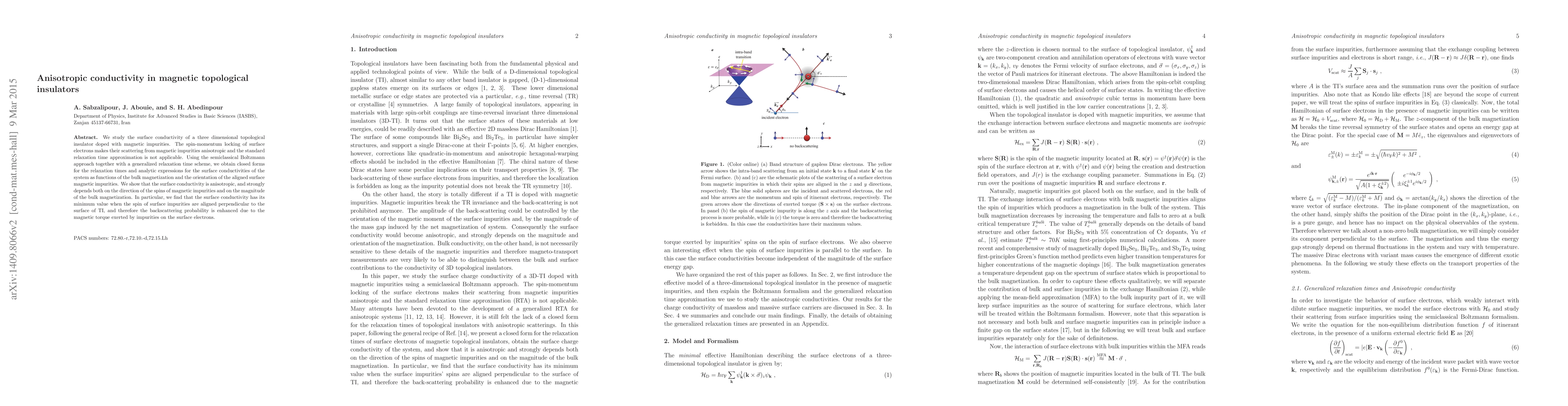 This paper investigates the anisotropic surface conductivity in magnetic topological insulators doped with magnetic impurities, revealing that the spin-momentum locking leads to anisotropic scattering. The study uses a generalized relaxation time scheme to derive expressions for surface conductivities, showing strong dependence on the orientation of impurity spins and bulk magnetization, with minimum conductivity when impurity spins are perpendicular to the surface.