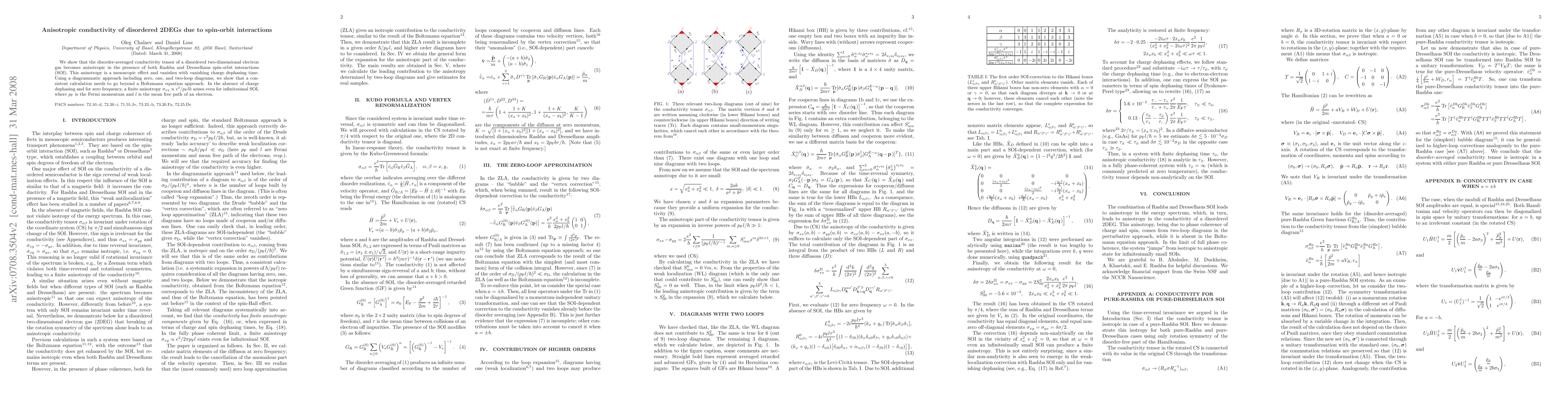 We show that the conductivity tensor of a disordered two-dimensional electron gas becomes anisotropic in the presence of both Rashba and Dresselhaus spin-orbit interactions (SOI). This anisotropy is a mesoscopic effect and vanishes with vanishing charge dephasing time. Using a diagrammatic approach including zero, one, and two-loop diagrams, we show that a consistent calculation needs to go beyond a Boltzmann equation approach. In the absence of charge dephasing and for zero frequency, a finite anisotropy \sigma_{xy} e^2/lhpf arises even for infinitesimal SOI.