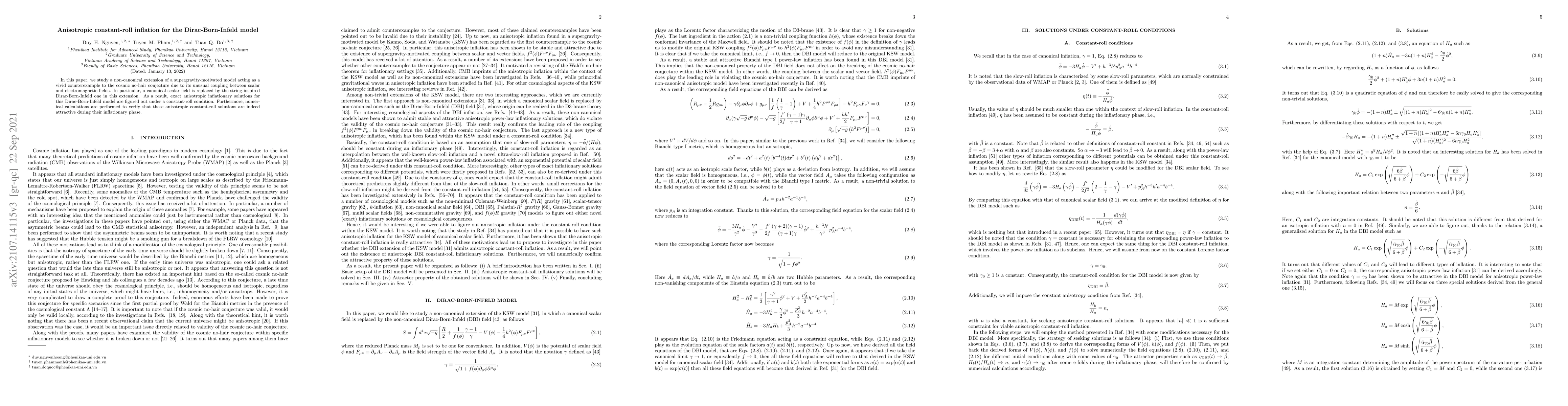 In this paper, we study a non-canonical extension of a supergravity-motivated model acting as a vivid counterexample to the cosmic no-hair conjecture due to its unusual coupling between scalar and electromagnetic fields. In particular, a canonical scalar field is replaced by the string-inspired Dirac-Born-Infeld one in this extension. As a result, exact anisotropic inflationary solutions for this Dirac-Born-Infeld model are figured out under a constant-roll condition. Furthermore, numerical calculations are performed to verify that these anisotropic constant-roll solutions are indeed attractive during their inflationary phase.