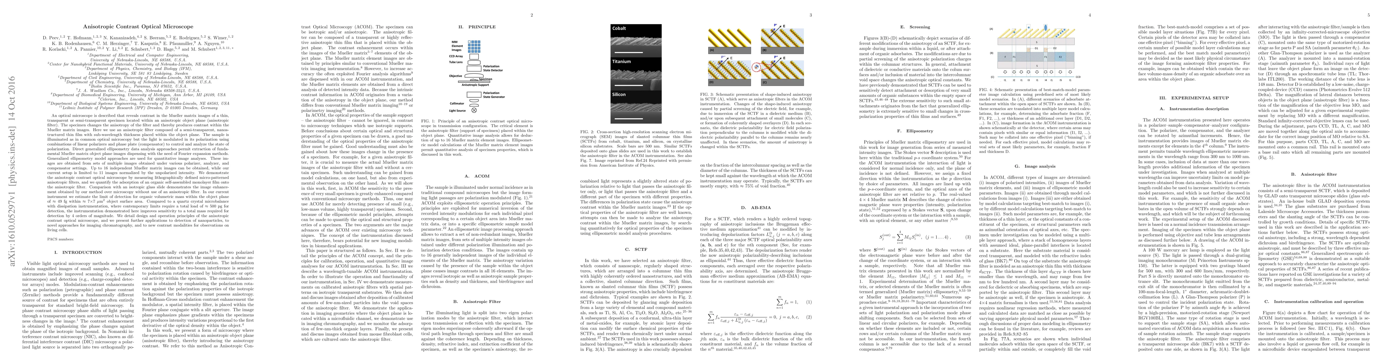 An optical microscope is described that reveals contrast in the Mueller matrix images of a thin, transparent or semi-transparent specimen located within an anisotropic object plane (anisotropic filter). The specimen changes the anisotropy of the filter and thereby produces contrast within the Mueller matrix images. Here we use an anisotropic filter composed of a semi-transparent, nanostructured thin film with sub-wavelength thickness placed within the object plane. The sample is illuminated as in common optical microscopy but the light is modulated in its polarization using combinations of linear polarizers and phase plate (compensator) to control and analyze the state of polarization. Direct generalized ellipsometry data analysis approaches permit extraction of fundamental Mueller matrix object plane images dispensing with the need of Fourier expansion methods. Generalized ellipsometry model approaches are used for quantitative image analyses. We demonstrate the anisotropic contrast optical microscope by measuring lithographically defined micro-patterned anisotropic filters, and we quantify the adsorption of an organic self-assembled monolayer film onto the anisotropic filter. In our current instrument we estimate the limit of detection for organic volumetric mass within the object plane of $\approx$ 49 fg within $\approx$ 7$\times$7~$\mu$m$^2$ object surface area. Compared to a quartz crystal microbalance with dissipation instrumentation, where contemporary limits require a total load of $\approx$ 500~pg for detection, the instrumentation demonstrated here improves sensitivity to a total mass required for detection by 4 orders of magnitude. We present further applications to detection of nanoparticles, to novel approaches for imaging chromatography, and to new contrast modalities for observations on living cells.