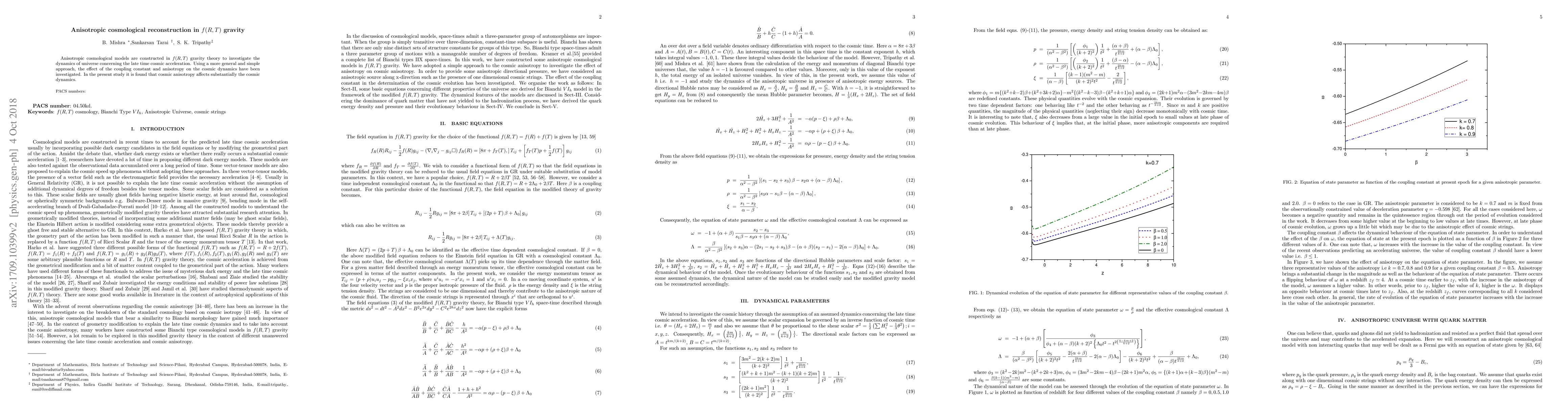 Summary: This paper constructs anisotropic cosmological models in $f(R,T)$ gravity to explore the dynamics of the universe's late-time acceleration, finding that cosmic anisotropy significantly influences cosmic dynamics. The study uses a general approach to examine the effects of coupling constants and anisotropy.