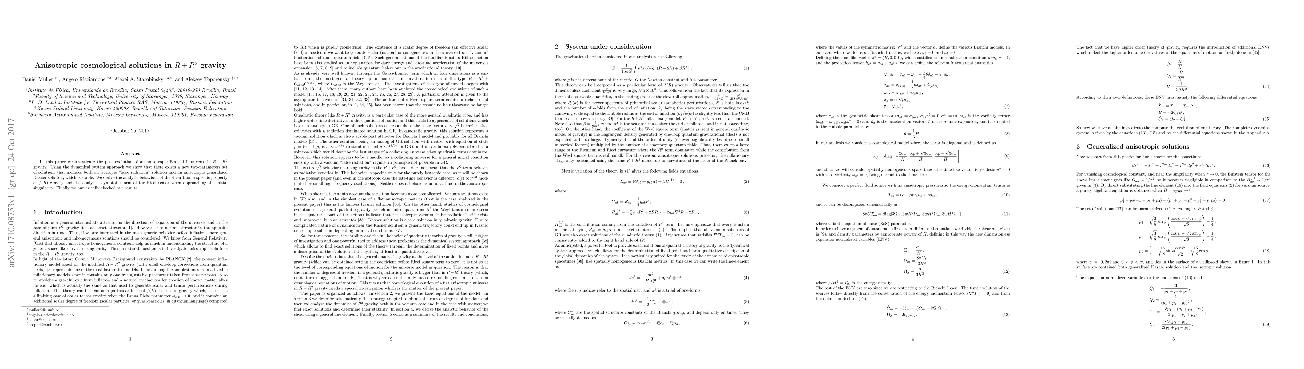 This paper explores anisotropic cosmological solutions in $R+R^2$ gravity, revealing a new set of two-parameter solutions including an isotropic "false radiation" solution and a stable anisotropic generalized Kasner solution. The study employs a dynamical system approach to derive the analytic behavior of shear and the Ricci scalar near the initial singularity, with numerical verification of the findings.