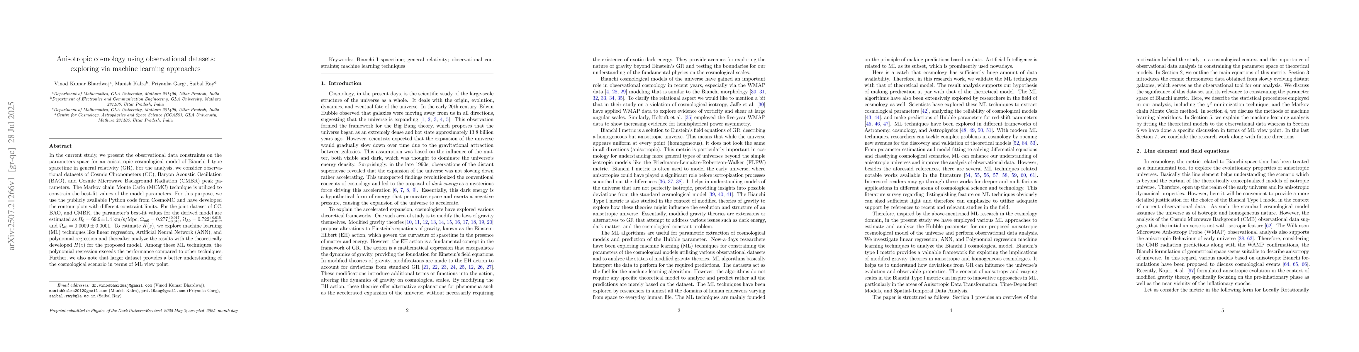 In the current study, we present the observational data constraints on the parameters space for an anisotropic cosmological model of Bianchi I type spacetime in general relativity (GR). For the analysis, we consider observational datasets of Cosmic Chronometers (CC), Baryon Acoustic Oscillation (BAO), and Cosmic Microwave Background Radiation (CMBR) peak parameters. The Markov chain Monte Carlo (MCMC) technique is utilized to constrain the bestfit values of the model parameters. For this purpose, we use the publicly available Python code from CosmoMC and have developed the contour plots with different constraint limits. For the joint dataset of CC, BAO, and CMBR, the parameter's best-fit values for the derived model are estimated as H_0 = 69.9\pm 1.4 km/s/Mpc, \Omega_{m0}=0.277^{+0.017}_{-0.015}, \Omega_{\Lambda 0} = 0.722^{+0.015}_{-0.017}, and \Omega_{\sigma 0} = 0.0009\pm0.0001. To estimate H(z), we explore machine learning (ML) techniques like linear regression, Artificial Neural Network (ANN), and polynomial regression and thereafter analyze the results with the theoretically developed H(z) for the proposed model. Among these ML techniques, the polynomial regression exceeds the performance compared to other techniques. Further, we also note that larger dataset provides a better understanding of the cosmological scenario in terms of ML view point.