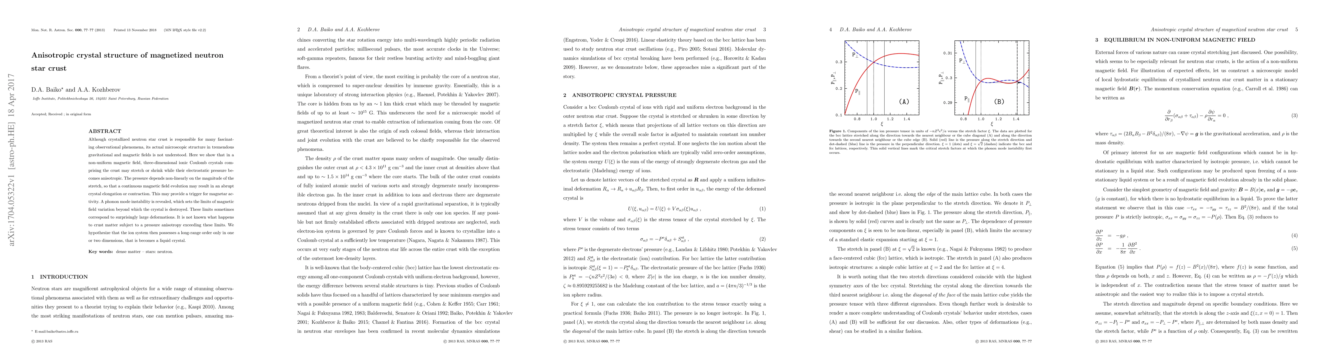 Although crystallized neutron star crust is responsible for many fascinating observational phenomena, its actual microscopic structure in tremendous gravitational and magnetic fields is not understood. Here we show that in a non-uniform magnetic field, three-dimensional ionic Coulomb crystals comprising the crust may stretch or shrink while their electrostatic pressure becomes anisotropic. The pressure depends non-linearly on the magnitude of the stretch, so that a continuous magnetic field evolution may result in an abrupt crystal elongation or contraction. This may provide a trigger for magnetar activity. A phonon mode instability is revealed, which sets the limits of magnetic field variation beyond which the crystal is destroyed. These limits sometimes correspond to surprisingly large deformations. It is not known what happens to crust matter subject to a pressure anisotropy exceeding these limits. We hypothesize that the ion system then possesses a long-range order only in one or two dimensions, that is becomes a liquid crystal.