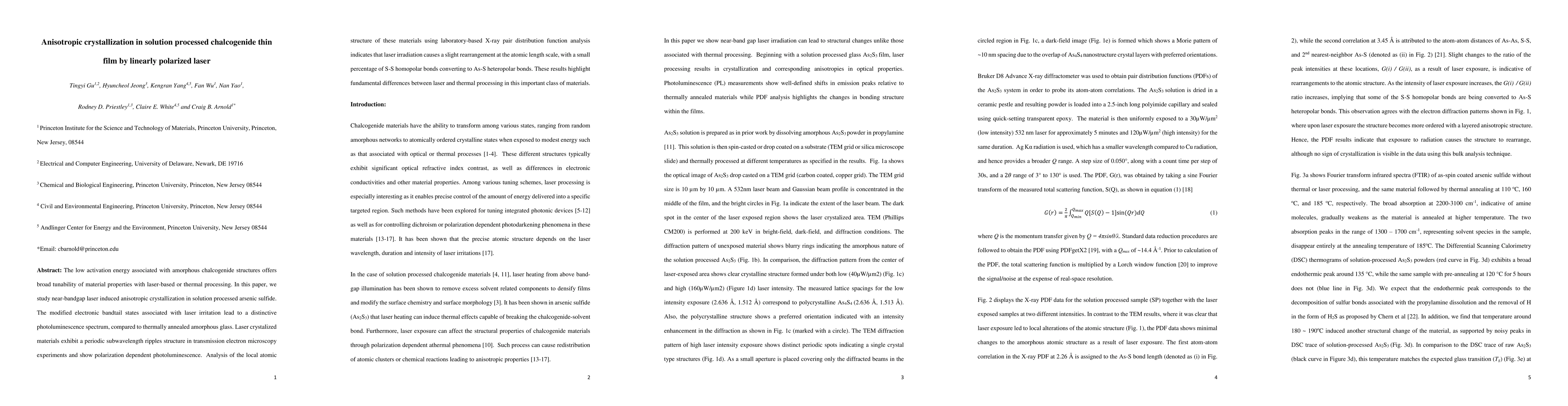 The low activation energy associated with amorphous chalcogenide structures offers broad tunability of material properties with laser-based or thermal processing. In this paper, we study near-bandgap laser induced anisotropic crystallization in solution processed arsenic sulfide. The modified electronic bandtail states associated with laser irritation lead to a distinctive photoluminescence spectrum, compared to thermally annealed amorphous glass. Laser crystalized materials exhibit a periodic subwavelength ripples structure in transmission electron microscopy experiments and show polarization dependent photoluminescence. Analysis of the local atomic structure of these materials using laboratory-based X-ray pair distribution function analysis indicates that laser irradiation causes a slight rearrangement at the atomic length scale, with a small percentage of S-S homopolar bonds converting to As-S heteropolar bonds. These results highlight fundamental differences between laser and thermal processing in this important class of materials.