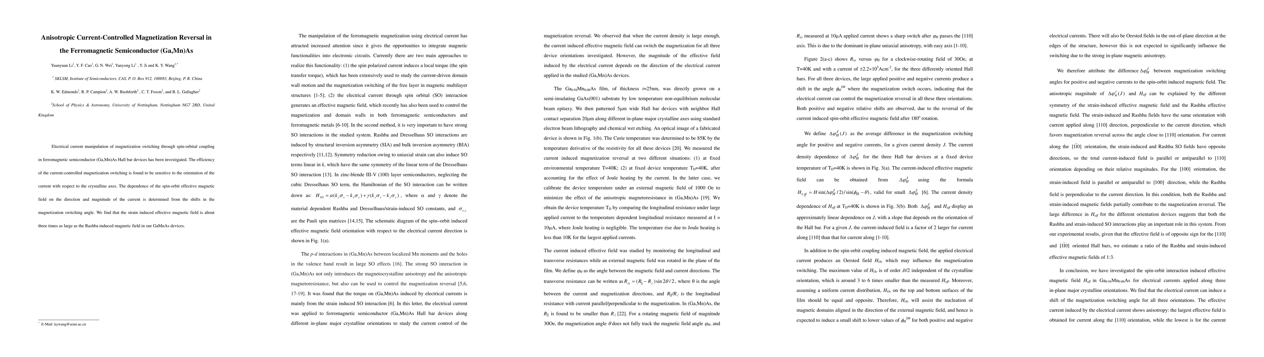 This study investigates the anisotropic effects of electrical current on magnetization reversal in (Ga,Mn)As, revealing that the efficiency of current-controlled switching depends on current orientation relative to crystalline axes. The strain-induced effective magnetic field is found to be significantly larger than the Rashba-induced magnetic field in these devices.