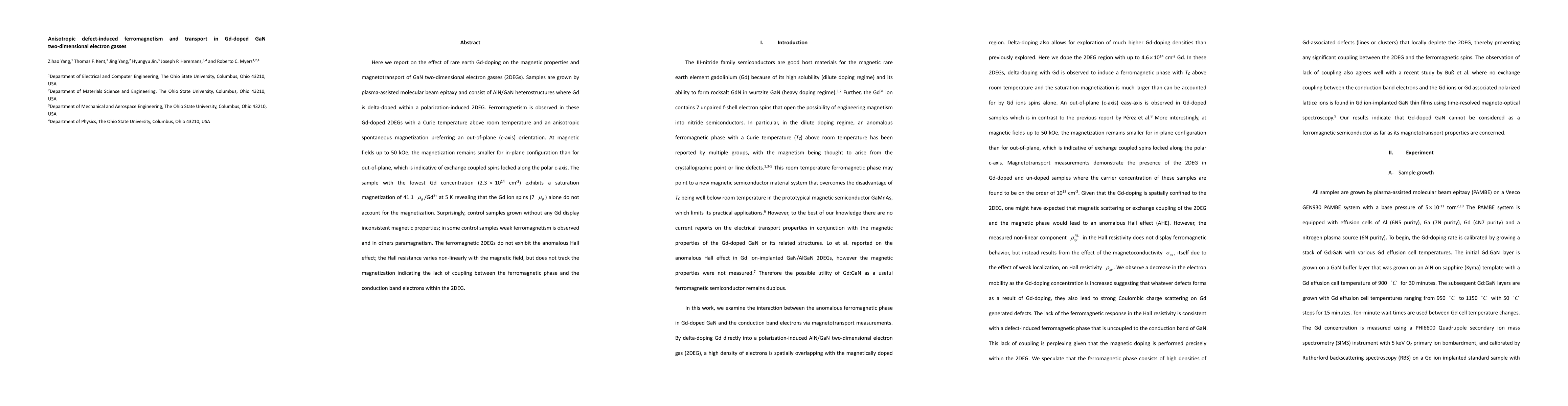 This study investigates Gd-doped GaN two-dimensional electron gases (2DEGs) grown via plasma-assisted molecular beam epitaxy, revealing anisotropic ferromagnetism with a Curie temperature above room temperature and a spontaneous magnetization favoring an out-of-plane orientation. The ferromagnetic 2DEGs do not exhibit the anomalous Hall effect, indicating a lack of coupling between the ferromagnetic phase and conduction band electrons.