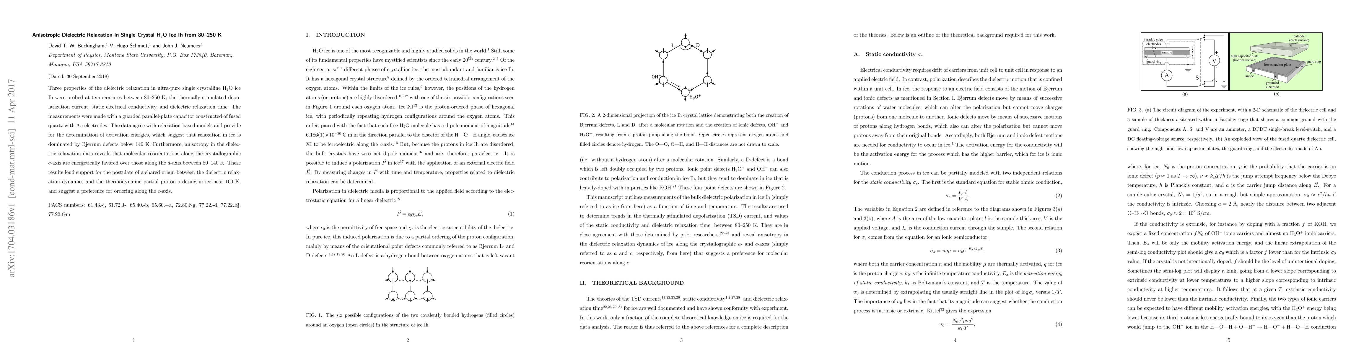 Three properties of the dielectric relaxation in ultra-pure single crystalline H$_{2}$O ice Ih were probed at temperatures between 80-250 K; the thermally stimulated depolarization current, static electrical conductivity, and dielectric relaxation time. The measurements were made with a guarded parallel-plate capacitor constructed of fused quartz with Au electrodes. The data agree with relaxation-based models and provide for the determination of activation energies, which suggest that relaxation in ice is dominated by Bjerrum defects below 140 K. Furthermore, anisotropy in the dielectric relaxation data reveals that molecular reorientations along the crystallographic $c$-axis are energetically favored over those along the $a$-axis between 80-140 K. These results lend support for the postulate of a shared origin between the dielectric relaxation dynamics and the thermodynamic partial proton-ordering in ice near 100 K, and suggest a preference for ordering along the $c$-axis.
