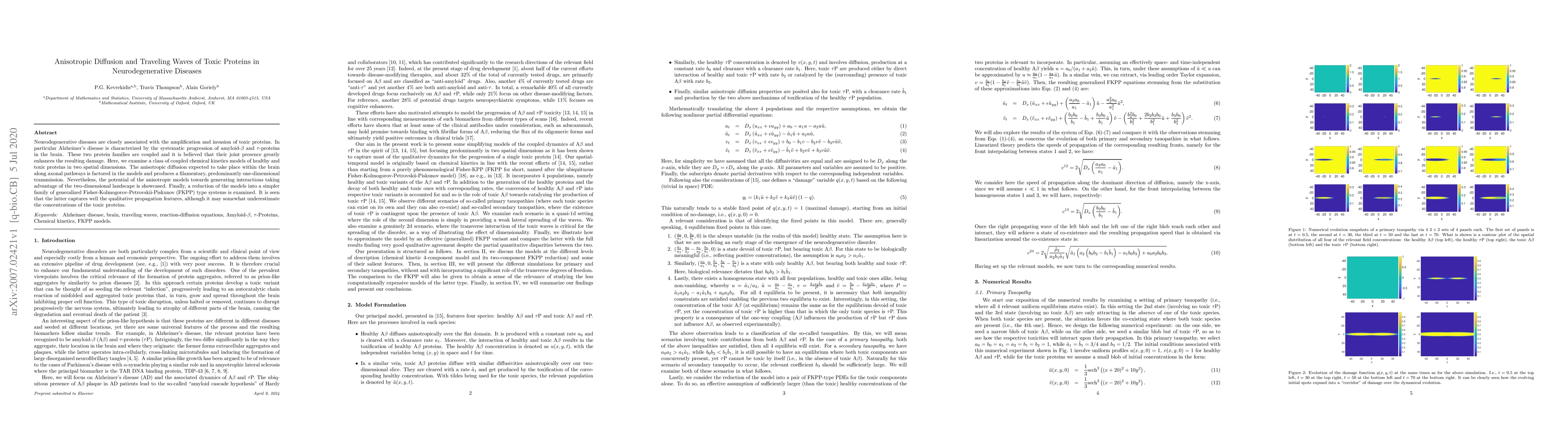Neurodegenerative diseases are closely associated with the amplification and invasion of toxic proteins. In particular Alzheimer's disease is characterized by the systematic progression of amyloid-$\beta$ and $\tau$-proteins in the brain. These two protein families are coupled and it is believed that their joint presence greatly enhances the resulting damage. Here, we examine a class of coupled chemical kinetics models of healthy and toxic proteins in two spatial dimensions. The anisotropic diffusion expected to take place within the brain along axonal pathways is factored in the models and produces a filamentary, predominantly one-dimensional transmission. Nevertheless, the potential of the anisotropic models towards generating interactions taking advantage of the two-dimensional landscape is showcased. Finally, a reduction of the models into a simpler family of generalized Fisher-Kolmogorov-Petrovskii-Piskunov (FKPP) type systems is examined. It is seen that the latter captures well the qualitative propagation features, although it may somewhat underestimate the concentrations of the toxic proteins.