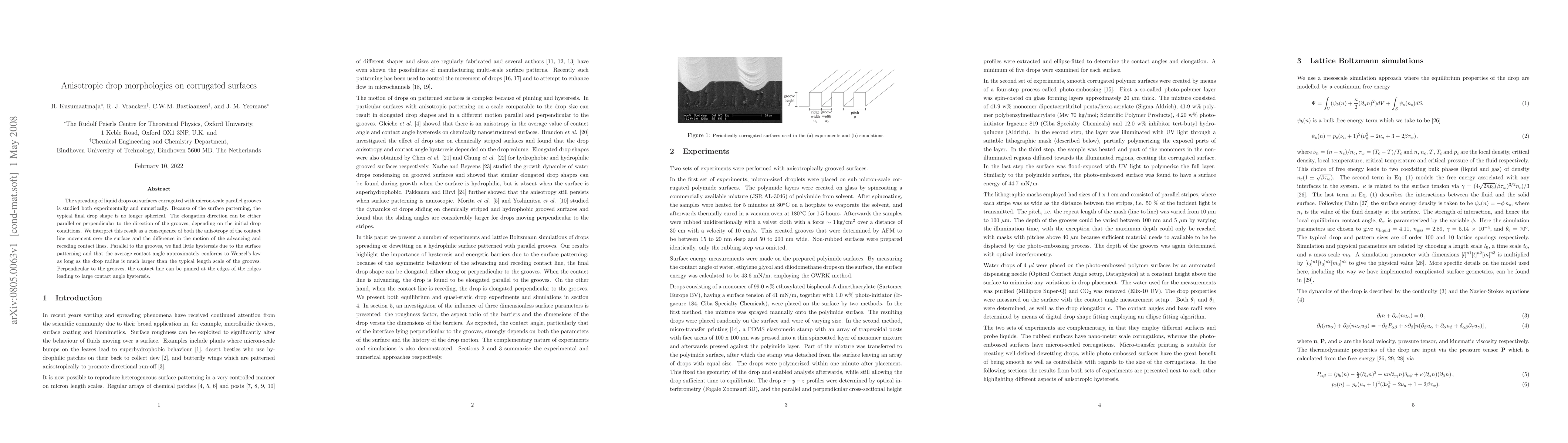 The spreading of liquid drops on surfaces corrugated with micron-scale parallel grooves is studied both experimentally and numerically. Because of the surface patterning, the typical final drop shape is no longer spherical. The elongation direction can be either parallel or perpendicular to the direction of the grooves, depending on the initial drop conditions. We interpret this result as a consequence of both the anisotropy of the contact line movement over the surface and the difference in the motion of the advancing and receding contact lines. Parallel to the grooves, we find little hysteresis due to the surface patterning and that the average contact angle approximately conforms to Wenzel's law as long as the drop radius is much larger than the typical length scale of the grooves. Perpendicular to the grooves, the contact line can be pinned at the edges of the ridges leading to large contact angle hysteresis.