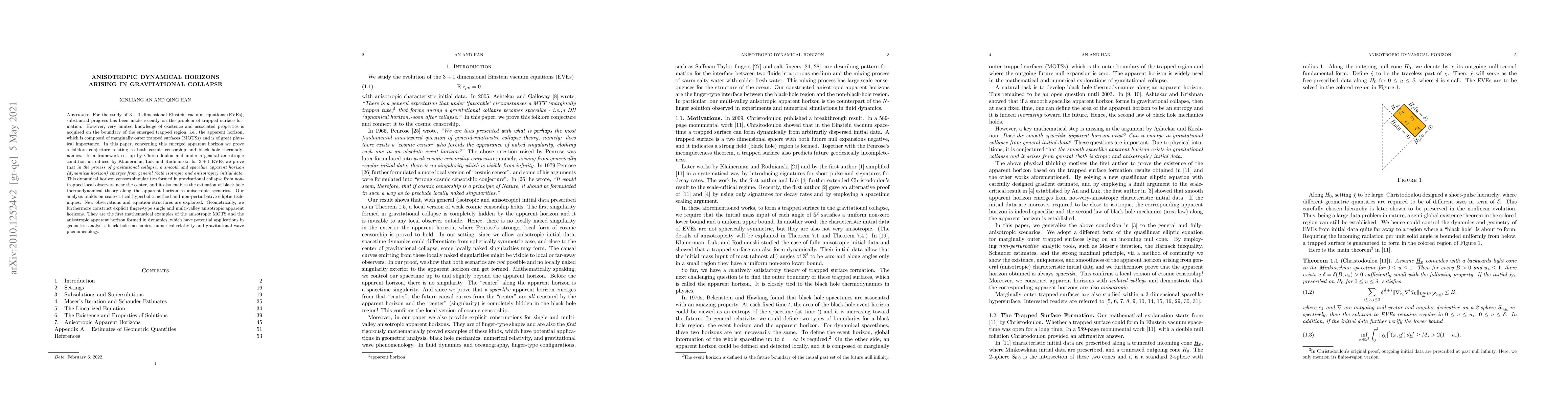 This paper proves the emergence of smooth, anisotropic dynamical horizons in gravitational collapse, addressing the boundary of trapped regions and extending black hole thermodynamics. The study leverages Christodoulou's framework and introduces new geometric constructions of anisotropic apparent horizons, contributing to black hole mechanics and numerical relativity.