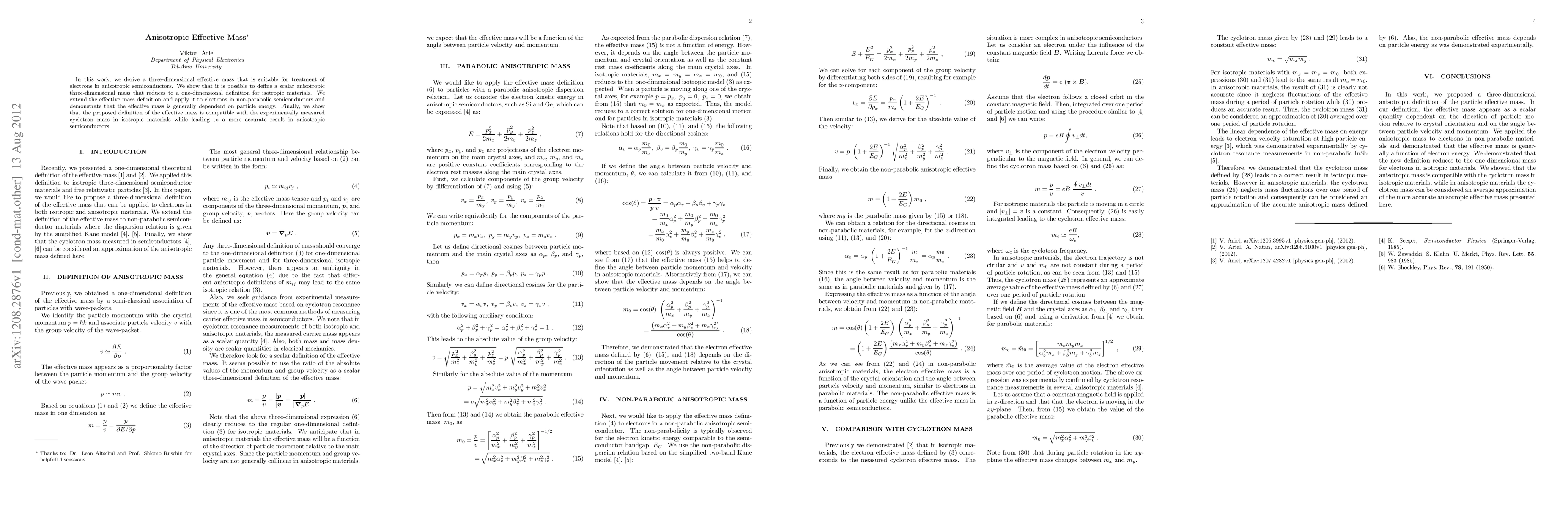 This paper derives a three-dimensional effective mass for electrons in anisotropic semiconductors, showing it reduces to a one-dimensional mass for isotropic materials. The proposed definition is shown to be compatible with experimental cyclotron mass measurements and provides a more accurate result for anisotropic semiconductors.