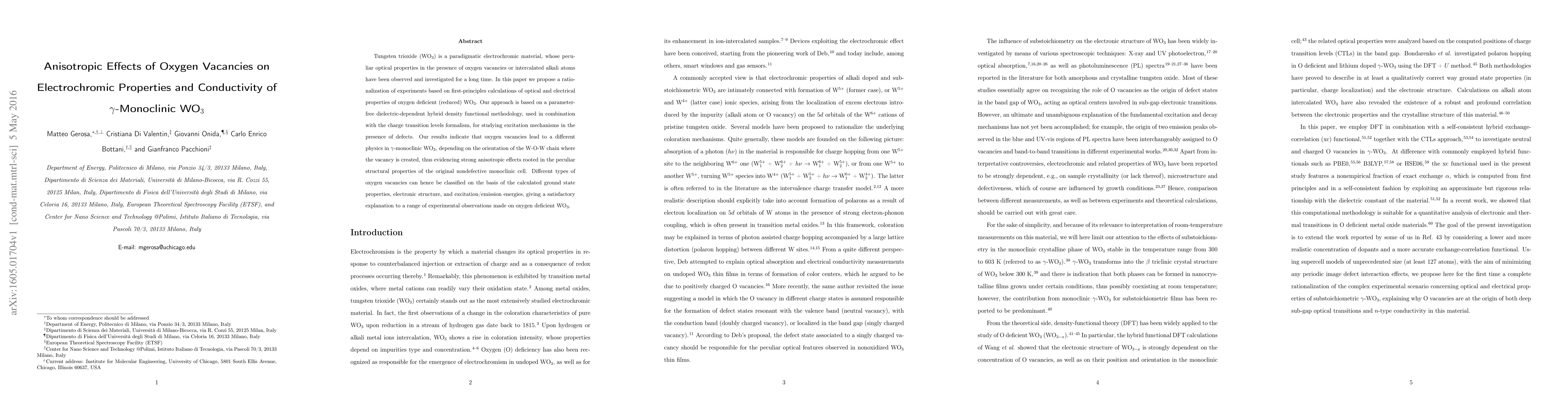 Tungsten trioxide (WO$_3$) is a paradigmatic electrochromic material, whose peculiar optical properties in the presence of oxygen vacancies or intercalated alkali atoms have been observed and investigated for a long time. In this paper we propose a rationalization of experiments based on first-principles calculations of optical and electrical properties of oxygen deficient (reduced) WO$_3$. Our approach is based on a parameter-free dielectric-dependent hybrid density functional methodology, used in combination with the charge transition levels formalism, for studying excitation mechanisms in the presence of defects. Our results indicate that oxygen vacancies lead to a different physics in $\gamma$-monoclinic WO$_3$, depending on the orientation of the W-O-W chain where the vacancy is created, thus evidencing strong anisotropic effects rooted in the peculiar structural properties of the original nondefective monoclinic cell. Different types of oxygen vacancies can hence be classified on the basis of the calculated ground state properties, electronic structure, and excitation/emission energies, giving a satisfactory explanation to a range of experimental observations made on oxygen deficient WO$_3$.