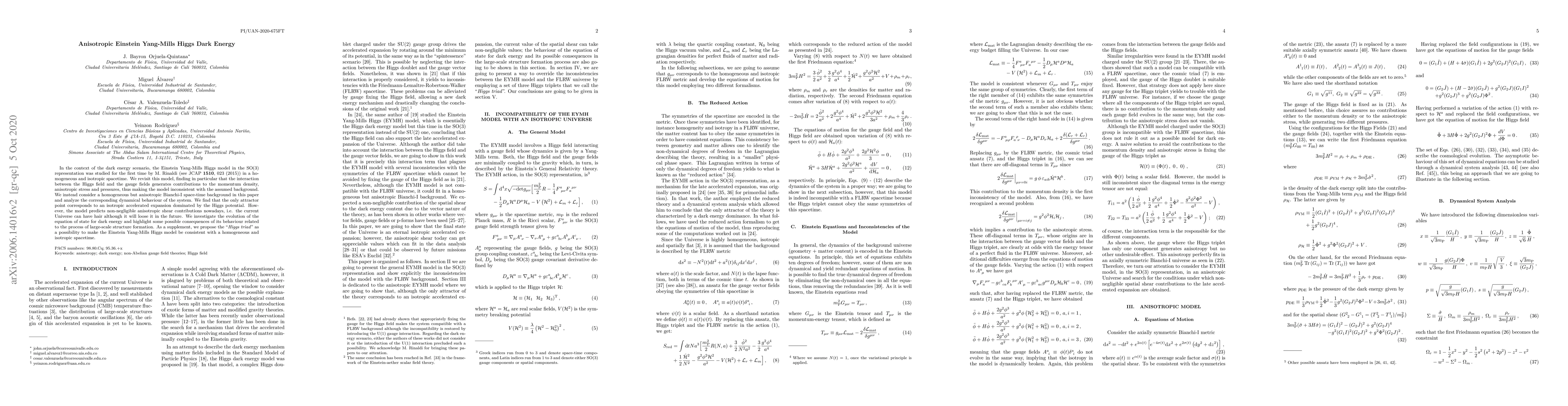 In the context of the dark energy scenario, the Einstein Yang-Mills Higgs model in the SO(3) representation was studied for the first time by M. Rinaldi (see JCAP 1510, 023 (2015)) in a homogeneous and isotropic spacetime. We revisit this model, finding in particular that the interaction between the Higgs field and the gauge fields generates contributions to the momentum density, anisotropic stress and pressures, thus making the model inconsistent with the assumed background. We instead consider a homogeneous but anisotropic Bianchi-I space-time background in this paper and analyze the corresponding dynamical behaviour of the system. We find that the only attractor point corresponds to an isotropic accelerated expansion dominated by the Higgs potential. However, the model predicts non-negligible anisotropic shear contributions nowadays, i.e. the current Universe can have hair although it will loose it in the future. We investigate the evolution of the equation of state for dark energy and highlight some possible consequences of its behaviour related to the process of large-scale structure formation. As a supplement, we propose the "Higgs triad" as a possibility to make the Einstein Yang-Mills Higgs model be consistent with a homogeneous and isotropic spacetime.