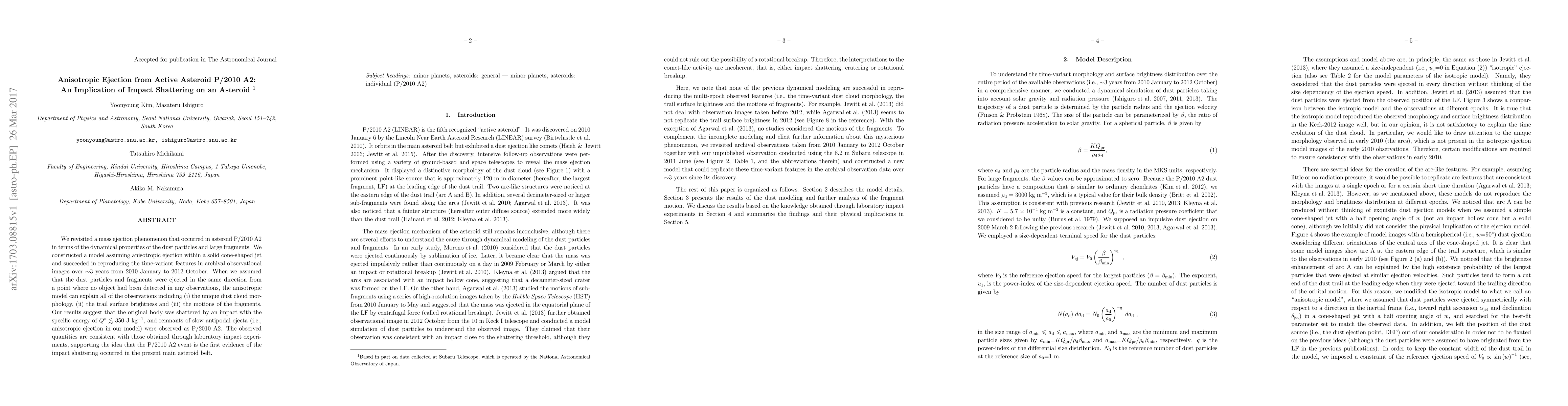 We revisited a mass ejection phenomenon that occurred in asteroid P/2010 A2 in terms of the dynamical properties of the dust particles and large fragments. We constructed a model assuming anisotropic ejection within a solid cone-shaped jet and succeeded in reproducing the time-variant features in archival observational images over ~3 years from 2010 January to 2012 October. When we assumed that the dust particles and fragments were ejected in the same direction from a point where no object had been detected in any observations, the anisotropic model can explain all of the observations including (i) the unique dust cloud morphology, (ii) the trail surface brightness and (iii) the motions of the fragments. Our results suggest that the original body was shattered by an impact with the specific energy of Q* <~ 350 J/kg, and remnants of slow antipodal ejecta (i.e., anisotropic ejection in our model) were observed as P/2010 A2. The observed quantities are consistent with those obtained through laboratory impact experiments, supporting the idea that the P/2010 A2 event is the first evidence of the impact shattering occurred in the present main asteroid belt.