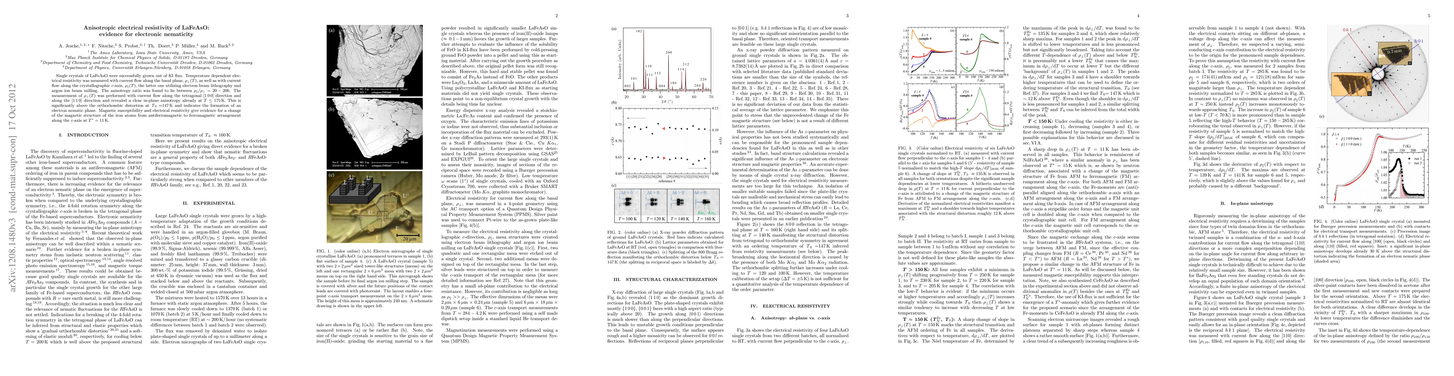 Researchers found evidence of electronic nematicity in LaFeAsO single crystals, with anisotropic electrical resistivity varying greatly depending on the direction of current flow. This indicates a phase transition to a ferromagnetic arrangement at 11K.