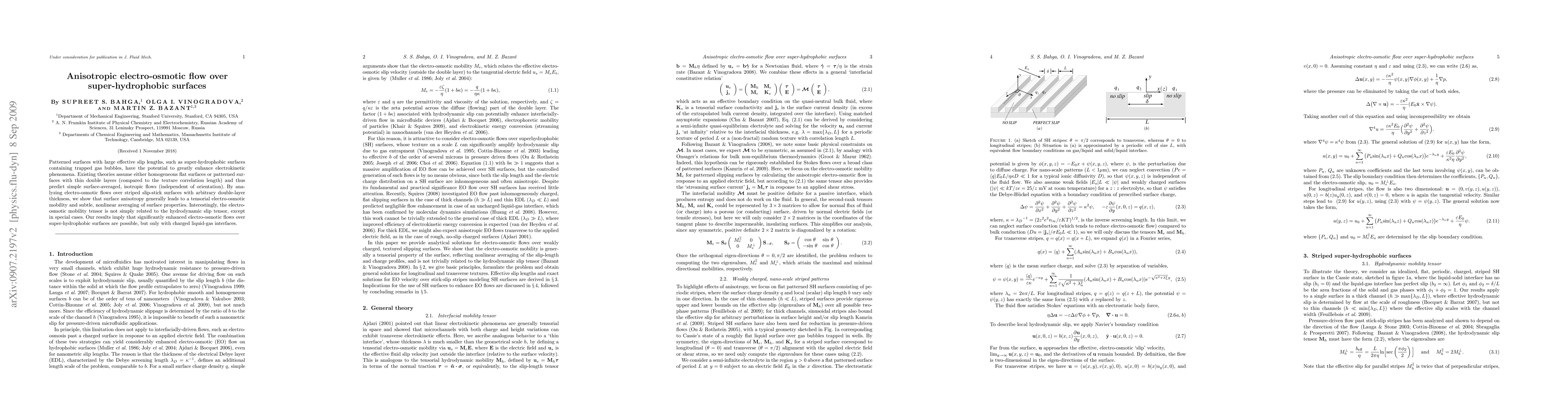 This study investigates electro-osmotic flows over super-hydrophobic surfaces, revealing that surface anisotropy results in tensorial electro-osmotic mobility and complex averaging of surface properties, suggesting significant enhancement of such flows with charged liquid-gas interfaces. Contrary to previous theories, the electro-osmotic mobility tensor does not straightforwardly relate to the hydrodynamic slip tensor.
