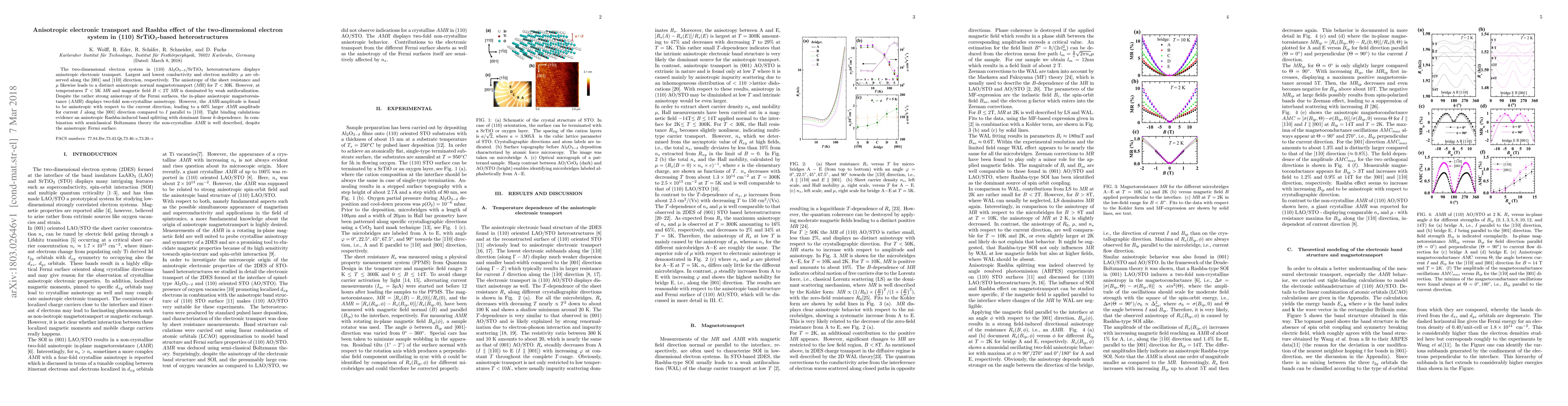 This paper investigates anisotropic electronic transport in (110) SrTiO$_3$-based heterostructures, revealing distinct conductivity and electron mobility along different crystallographic directions. The study finds that the anisotropic magnetoresistance is well described by semiclassical theory, with a significant Rashba-induced band splitting effect.