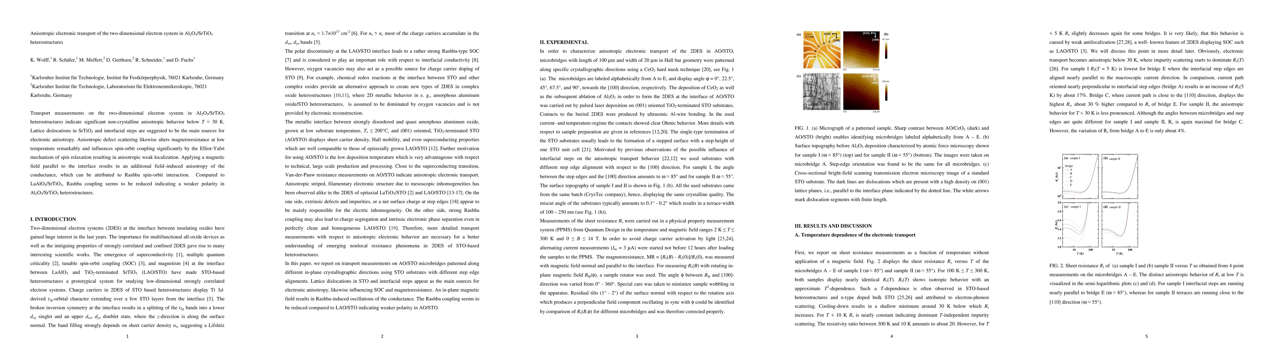 This study investigates the anisotropic electronic transport in Al2O3/SrTiO3 heterostructures, revealing significant noncrystalline anisotropy below 30 K. The main sources of this anisotropy are lattice dislocations and interfacial steps, which influence magnetoresistance and spin-orbit coupling.