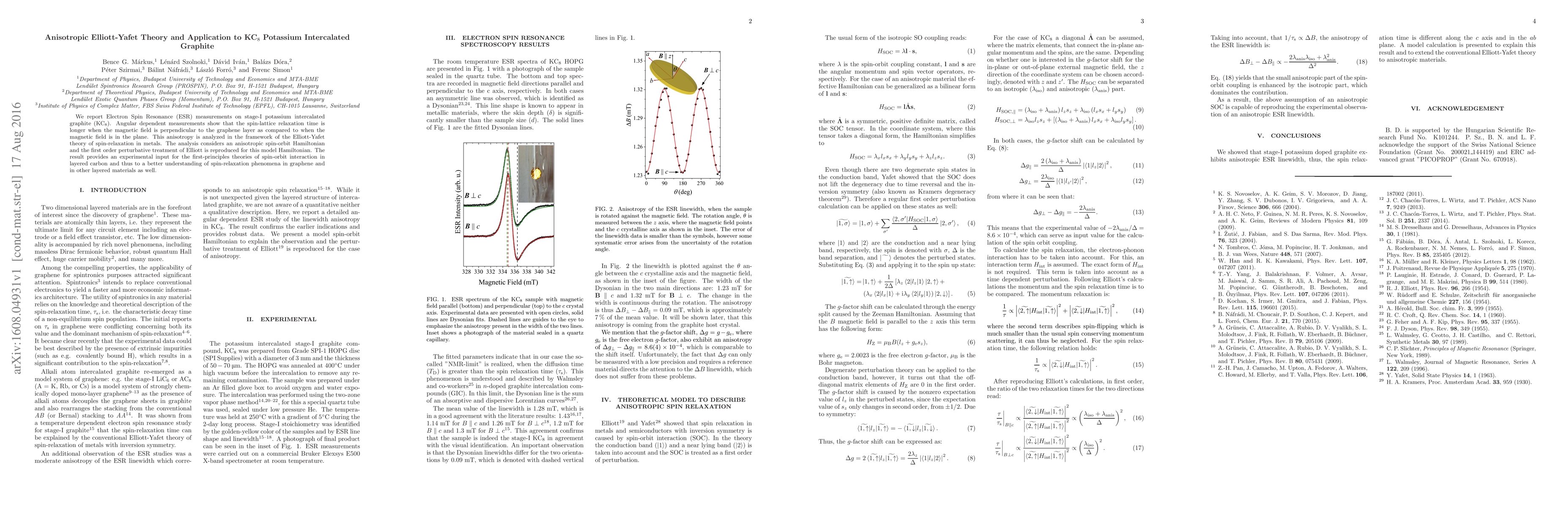 Researchers study anisotropic spin relaxation in KC$_8$ potassium intercalated graphite using ESR measurements, revealing longer spin-lattice relaxation times perpendicular to the graphene layer.