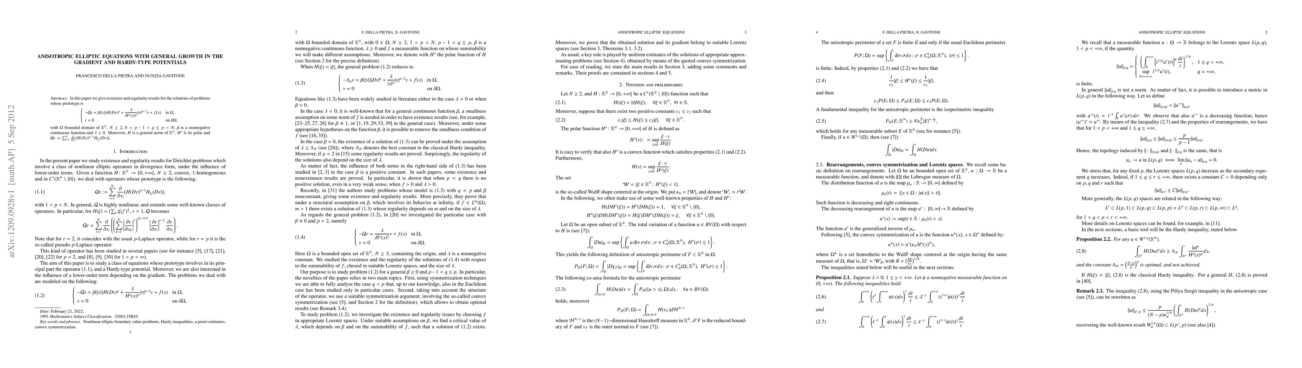 We give existence and regularity results for solutions of some nonlinear elliptic problems. The equations we deal with are modeled on a problem which involves in its principal part an anisotropic operator, a Hardy-type potential, and a lower-order term depending on the gradient.