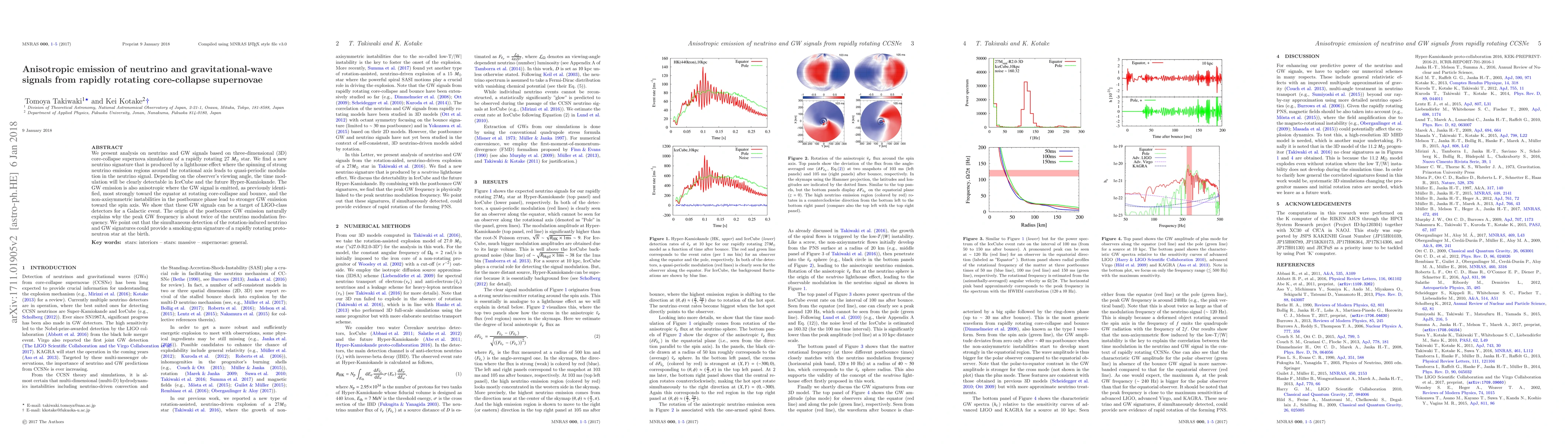 This paper analyzes neutrino and gravitational-wave (GW) signals from a rapidly rotating core-collapse supernova, revealing anisotropic emission patterns. The study identifies a lighthouse effect causing quasi-periodic modulation in neutrino signals detectable from certain angles, and shows that GW signals are strongest toward the equator and spin axis, potentially observable by LIGO-class detectors.