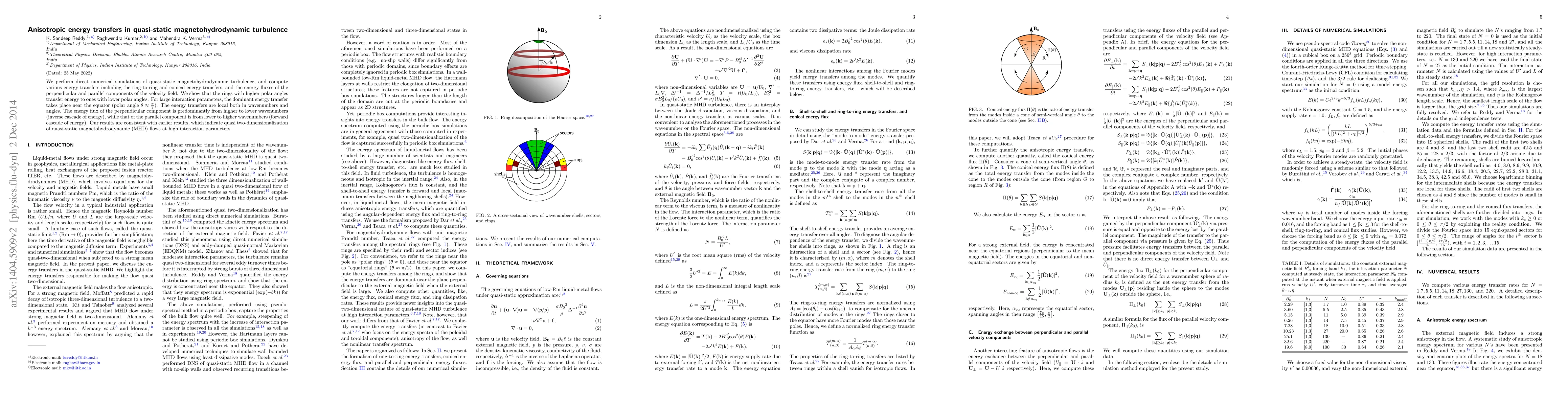 The study uses direct numerical simulations of quasi-static magnetohydrodynamic (MHD) turbulence to compute energy transfers including ring-to-ring and conical energy transfers, and the energy fluxes of the perpendicular and parallel components of the velocity field.
