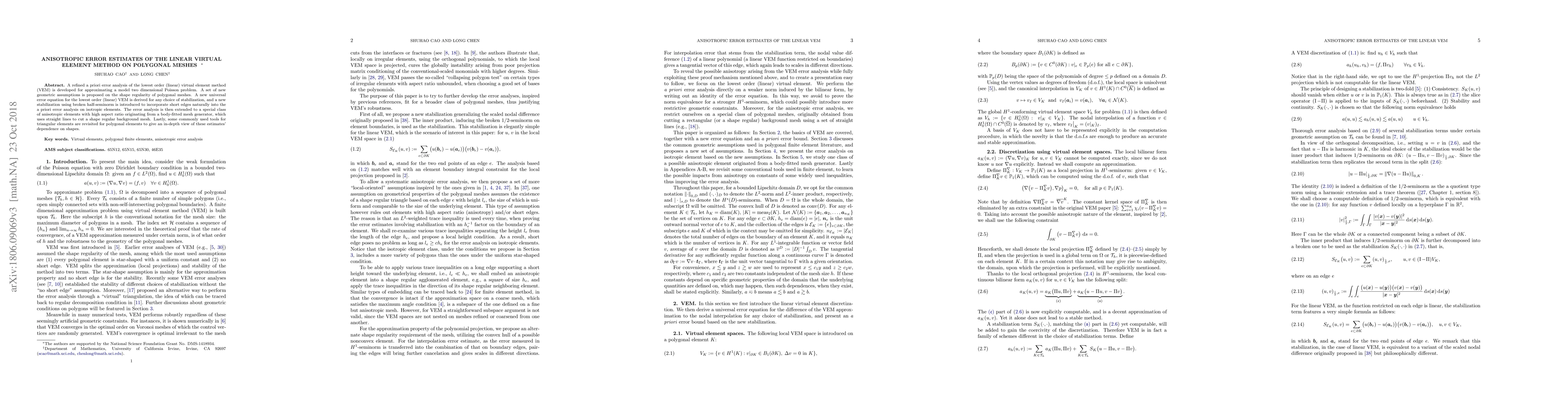 A refined a priori error analysis of the lowest order (linear) Virtual Element Method (VEM) is developed for approximating a model two dimensional Poisson problem. A set of new geometric assumptions is proposed on shape regularity of polygonal meshes. A new universal error equation for the lowest order (linear) VEM is derived for any choice of stabilization, and a new stabilization using broken half-seminorm is introduced to incorporate short edges naturally into the a priori error analysis on isotropic elements. The error analysis is then extended to a special class of anisotropic elements with high aspect ratio originating from a body-fitted mesh generator, which uses straight lines to cut a shape regular background mesh. Lastly, some commonly used tools for triangular elements are revisited for polygonal elements to give an in-depth view of these estimates' dependence on shapes.